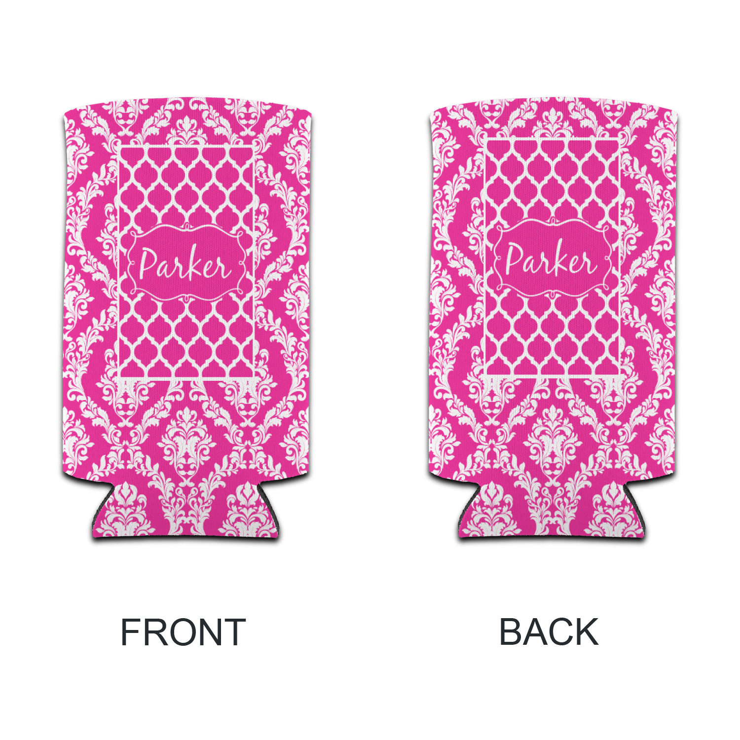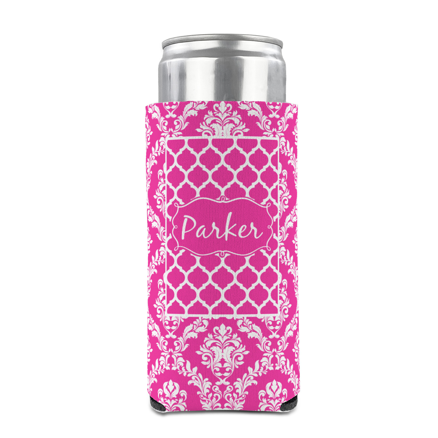 This is one of our new concentric design style - where you can use any two patterns together - we have chose to feature our damask and moroccan / trellis patterns. We chose our hot pink and white for our colors and curlz label with a name for personalization.