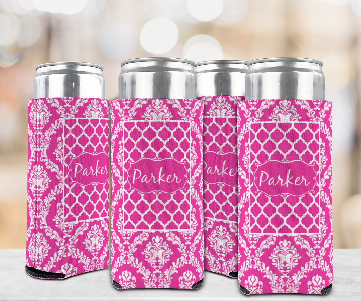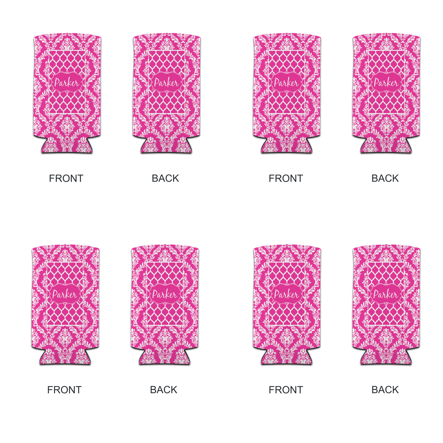 This is one of our new concentric design style - where you can use any two patterns together - we have chose to feature our damask and moroccan / trellis patterns. We chose our hot pink and white for our colors and curlz label with a name for personalization.