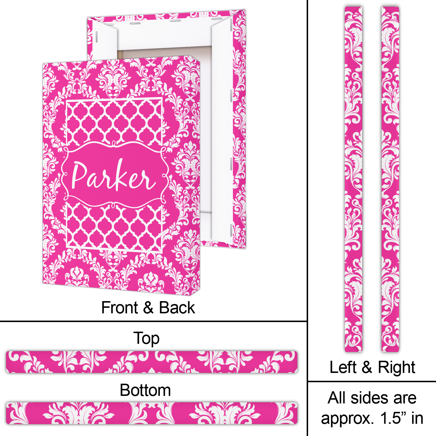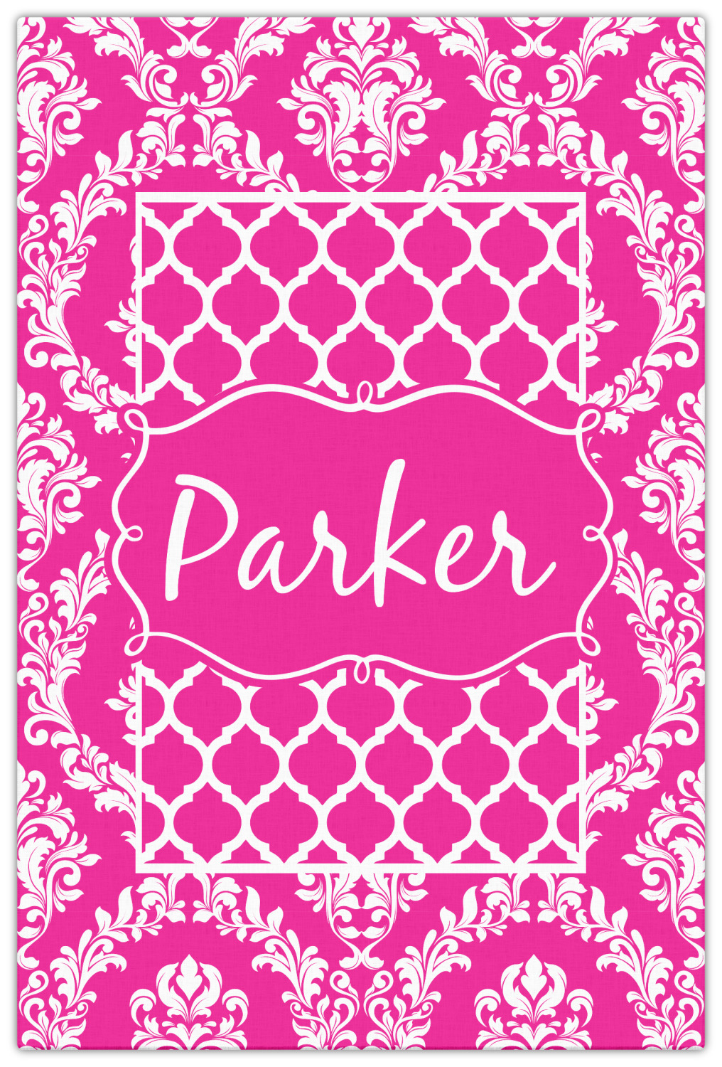 This is one of our new concentric design style - where you can use any two patterns together - we have chose to feature our damask and moroccan / trellis patterns. We chose our hot pink and white for our colors and curlz label with a name for personalization.