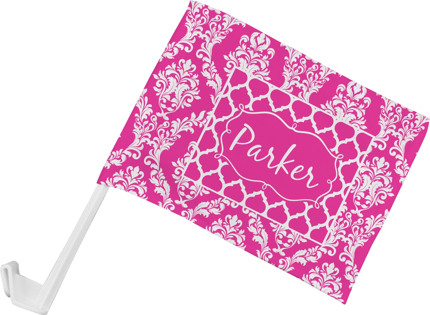 Our personalized flags are made from a durable, yet lightweight cloth that will proudly bear your logo or design of choice, while withstanding the outside elements. We have two size options - 8" x 11" and 11" x 15". Both come with a flag pole which includes a clip that secures the pole to the side window, whether it is rolled up or down. The flags are printed on both sides to display your design from all directions.