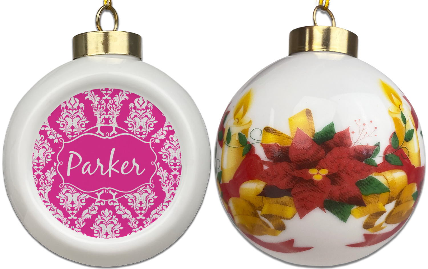 Our Christmas ornaments are a unique ceramic ball shape with a twist as it has a flat face to display your custom design! Select from one of our two design types - Christmas Tree or Poinsettia Garland - to adorn the curved back of your personal design. Each ornament measures 3H x 2.5W x 2D accompanied with a gold string accent for finishing touches to hang on your beautiful Christmas tree!