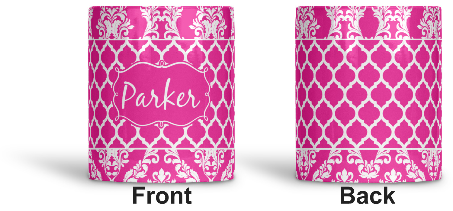 This is one of our new concentric design style - where you can use any two patterns together - we have chose to feature our damask and moroccan / trellis patterns. We chose our hot pink and white for our colors and curlz label with a name for personalization.