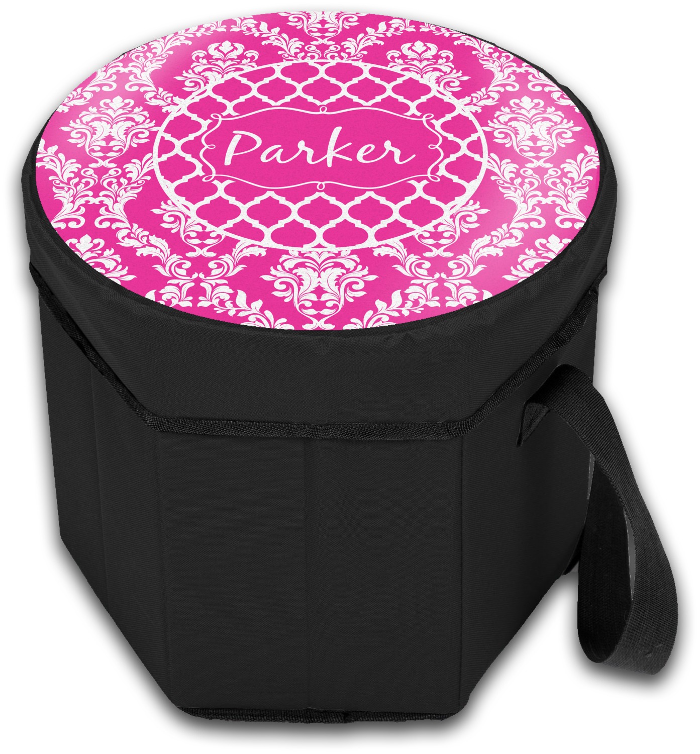 Our collapsible insulated coolers feature a unique six-sided hexagon shape, are lightweight, durable and can be turned into a seat. This cooler is fully insulated with silver foil lining to keep food and drinks hot or cold, and has a 12-quart capacity. Although this cooler collapses for easy transport, hidden inside are composition panels made of sturdy wood that give the frame strength and allow this cooler to be used as a seat. Simply sit down on the personalized cover and give your legs a break! (Maximum weight capacity of 200 pounds.)