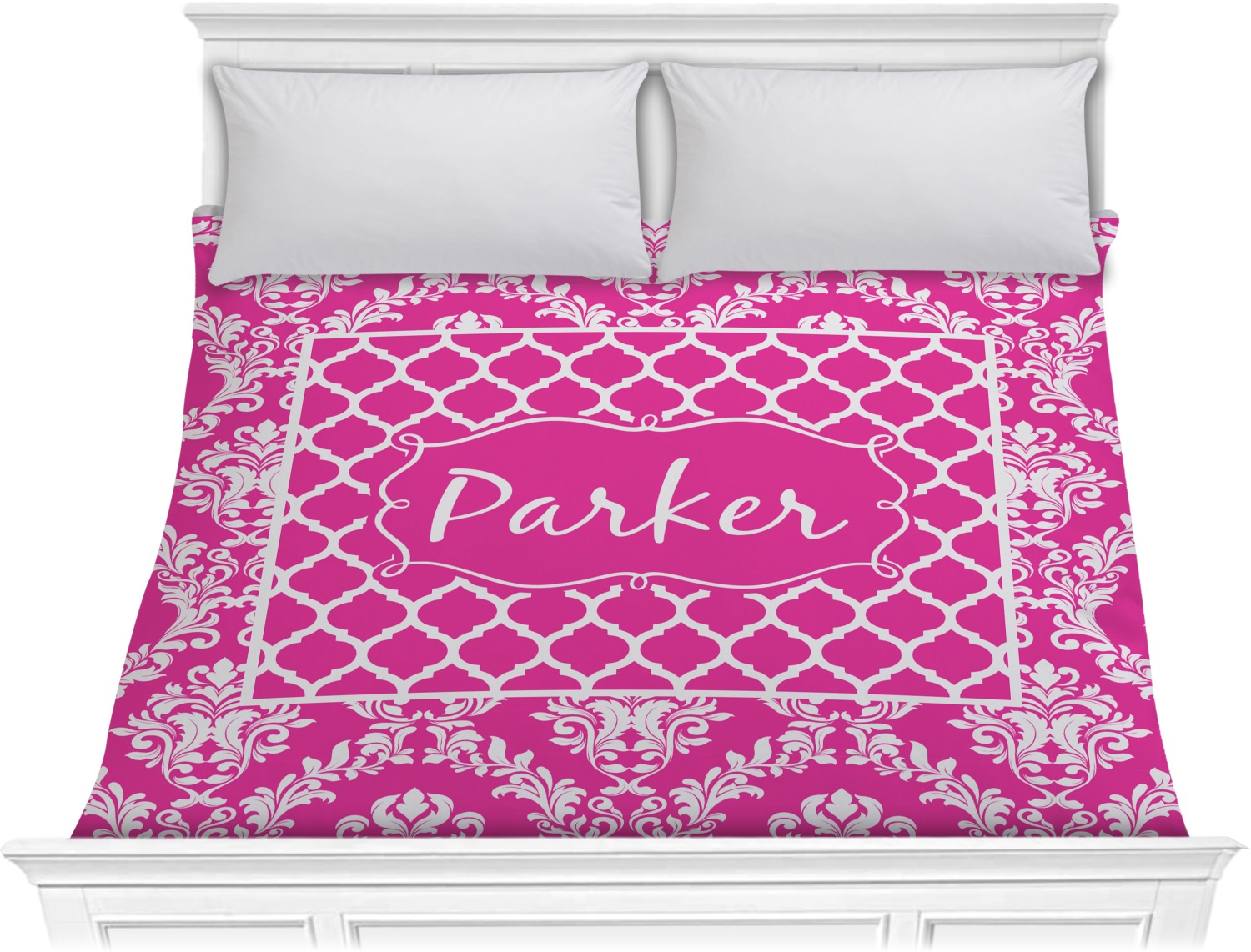This is one of our new concentric design style - where you can use any two patterns together - we have chose to feature our damask and moroccan / trellis patterns. We chose our hot pink and white for our colors and curlz label with a name for personalization.