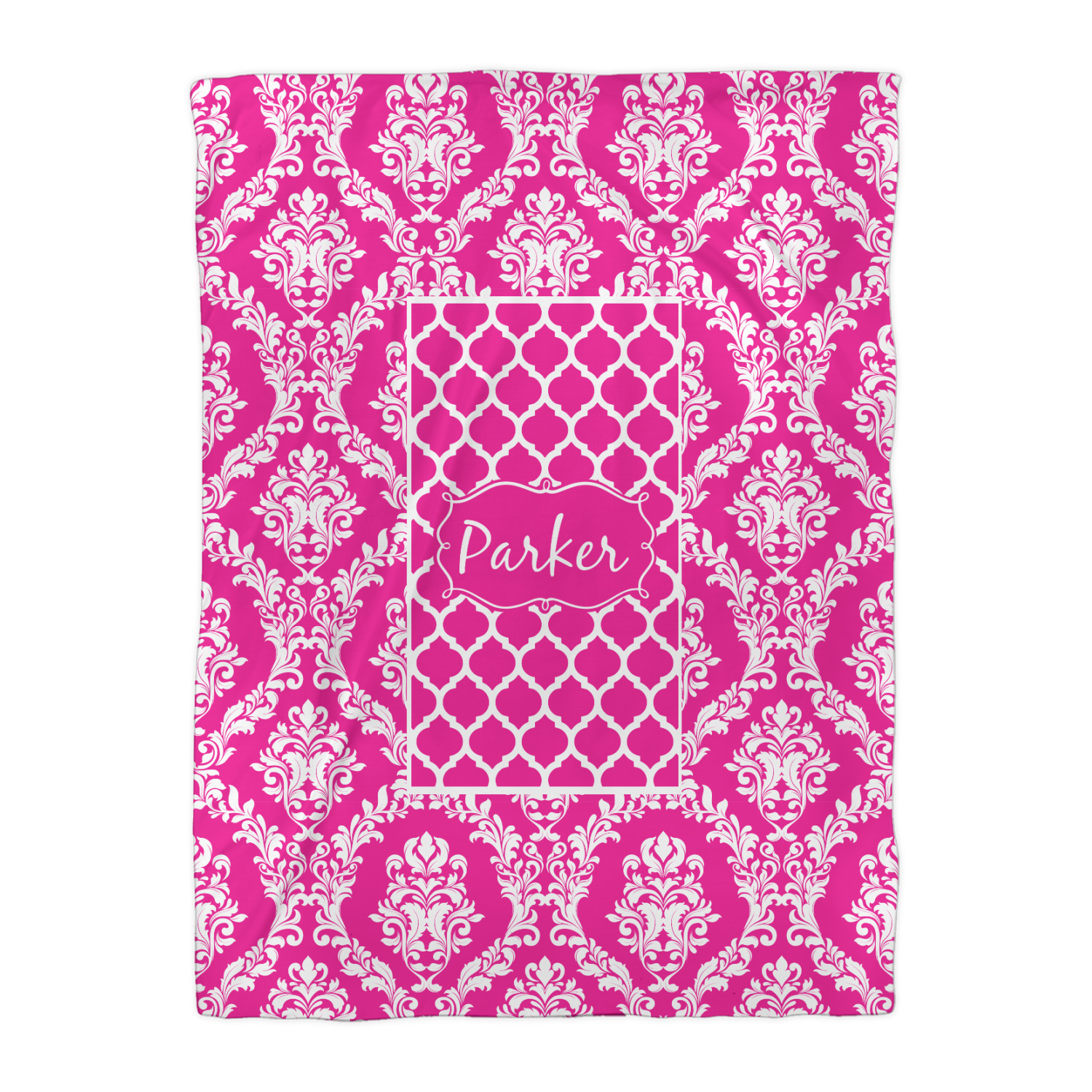 This is one of our new concentric design style - where you can use any two patterns together - we have chose to feature our damask and moroccan / trellis patterns. We chose our hot pink and white for our colors and curlz label with a name for personalization.