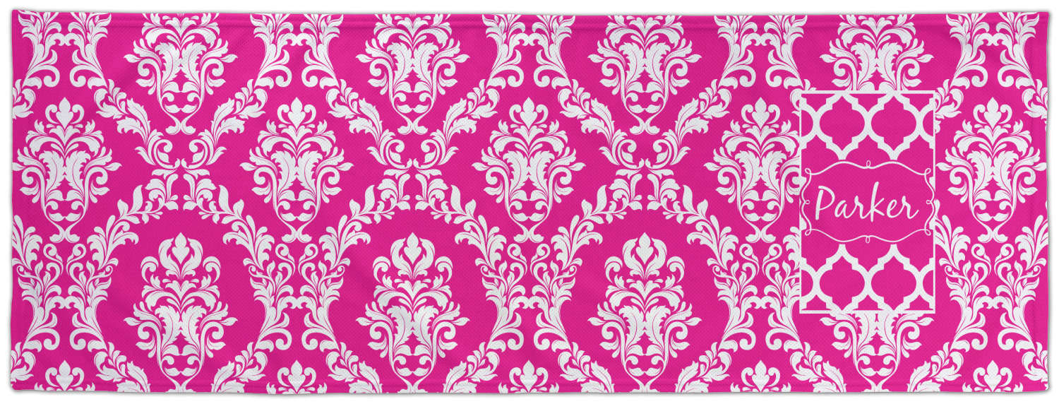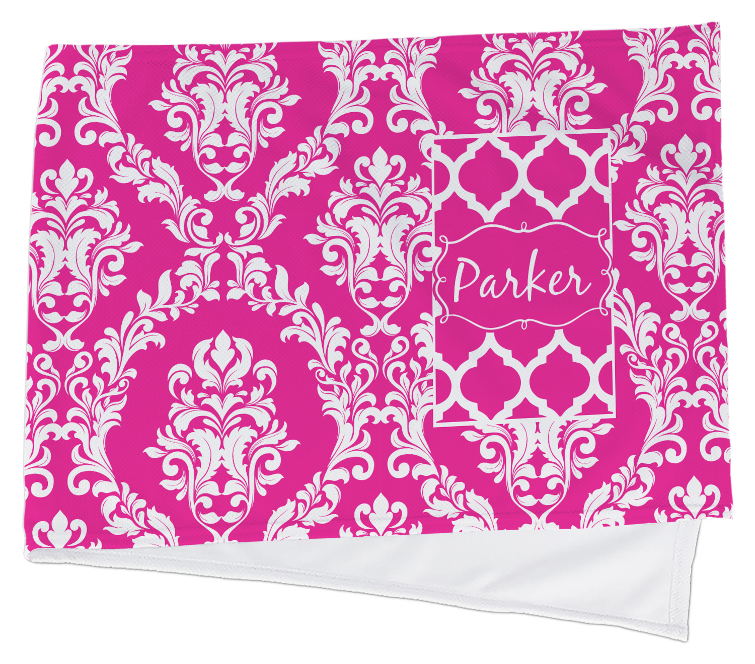 This is one of our new concentric design style - where you can use any two patterns together - we have chose to feature our damask and moroccan / trellis patterns. We chose our hot pink and white for our colors and curlz label with a name for personalization.