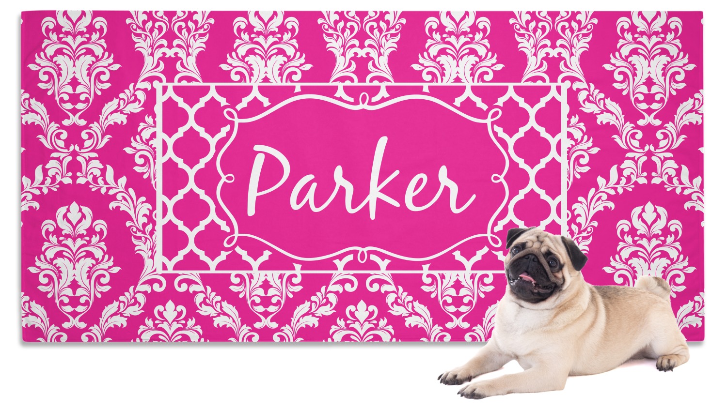 This is one of our new concentric design style - where you can use any two patterns together - we have chose to feature our damask and moroccan / trellis patterns. We chose our hot pink and white for our colors and curlz label with a name for personalization.