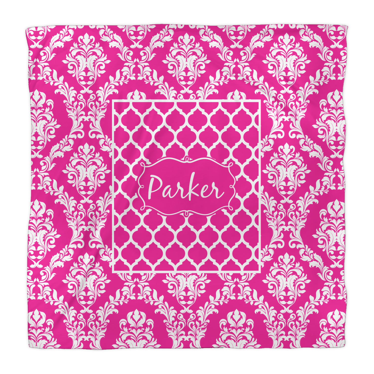 This is one of our new concentric design style - where you can use any two patterns together - we have chose to feature our damask and moroccan / trellis patterns. We chose our hot pink and white for our colors and curlz label with a name for personalization.
