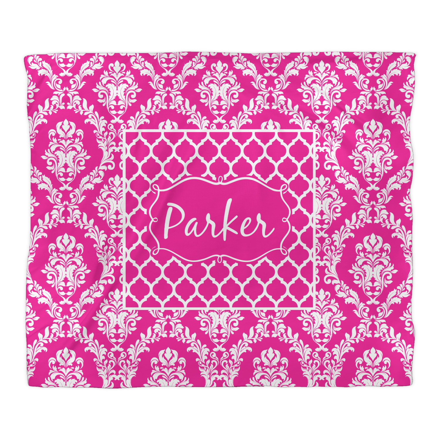 This is one of our new concentric design style - where you can use any two patterns together - we have chose to feature our damask and moroccan / trellis patterns. We chose our hot pink and white for our colors and curlz label with a name for personalization.