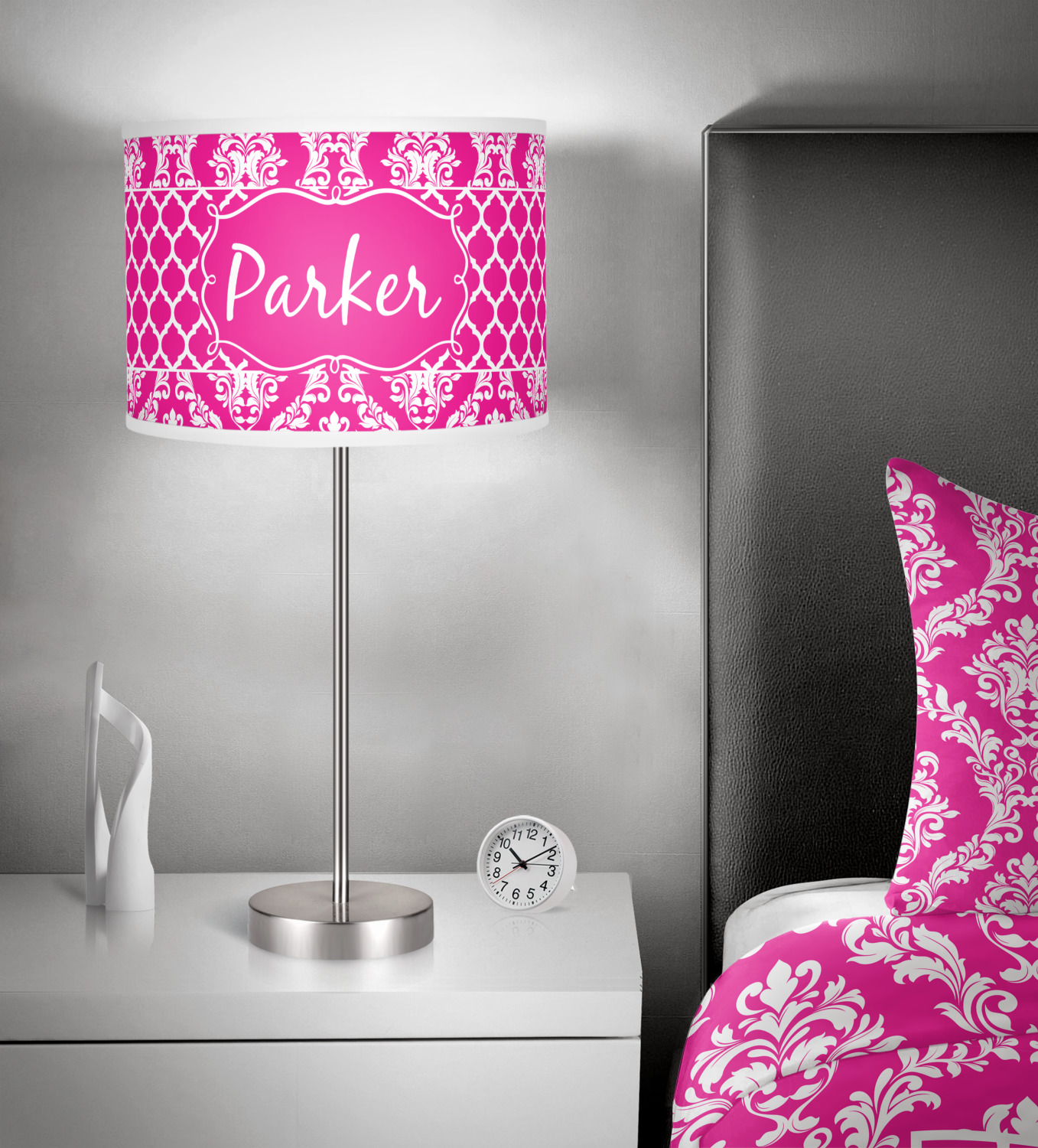 This is one of our new concentric design style - where you can use any two patterns together - we have chose to feature our damask and moroccan / trellis patterns. We chose our hot pink and white for our colors and curlz label with a name for personalization.