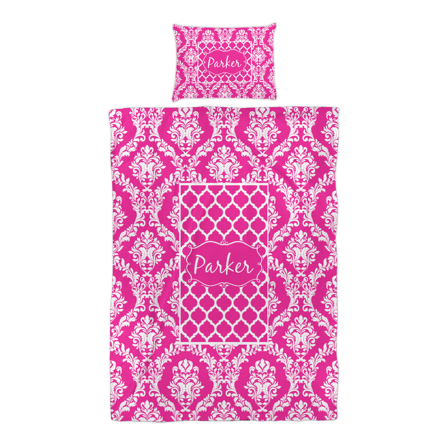 This is one of our new concentric design style - where you can use any two patterns together - we have chose to feature our damask and moroccan / trellis patterns. We chose our hot pink and white for our colors and curlz label with a name for personalization.