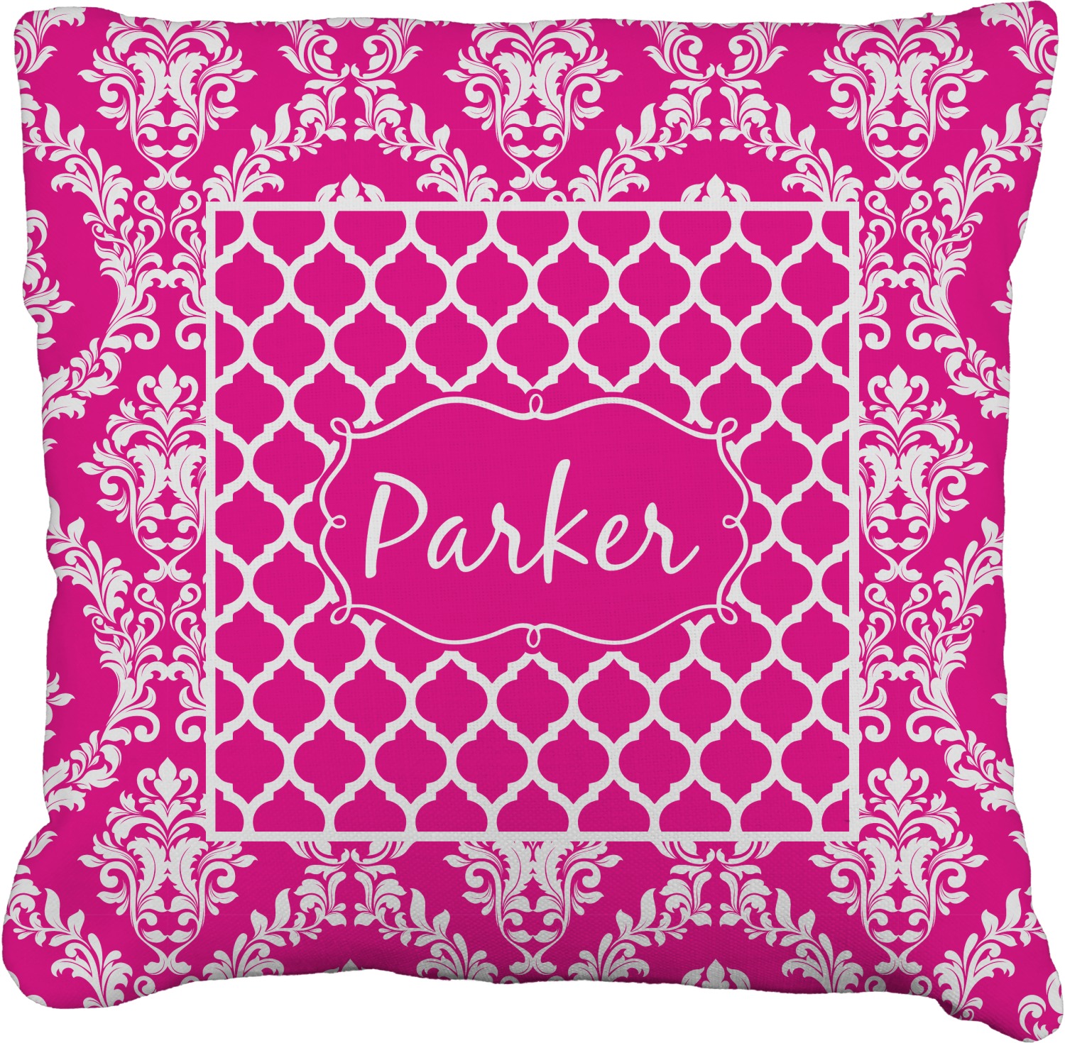 This is one of our new concentric design style - where you can use any two patterns together - we have chose to feature our damask and moroccan / trellis patterns. We chose our hot pink and white for our colors and curlz label with a name for personalization.