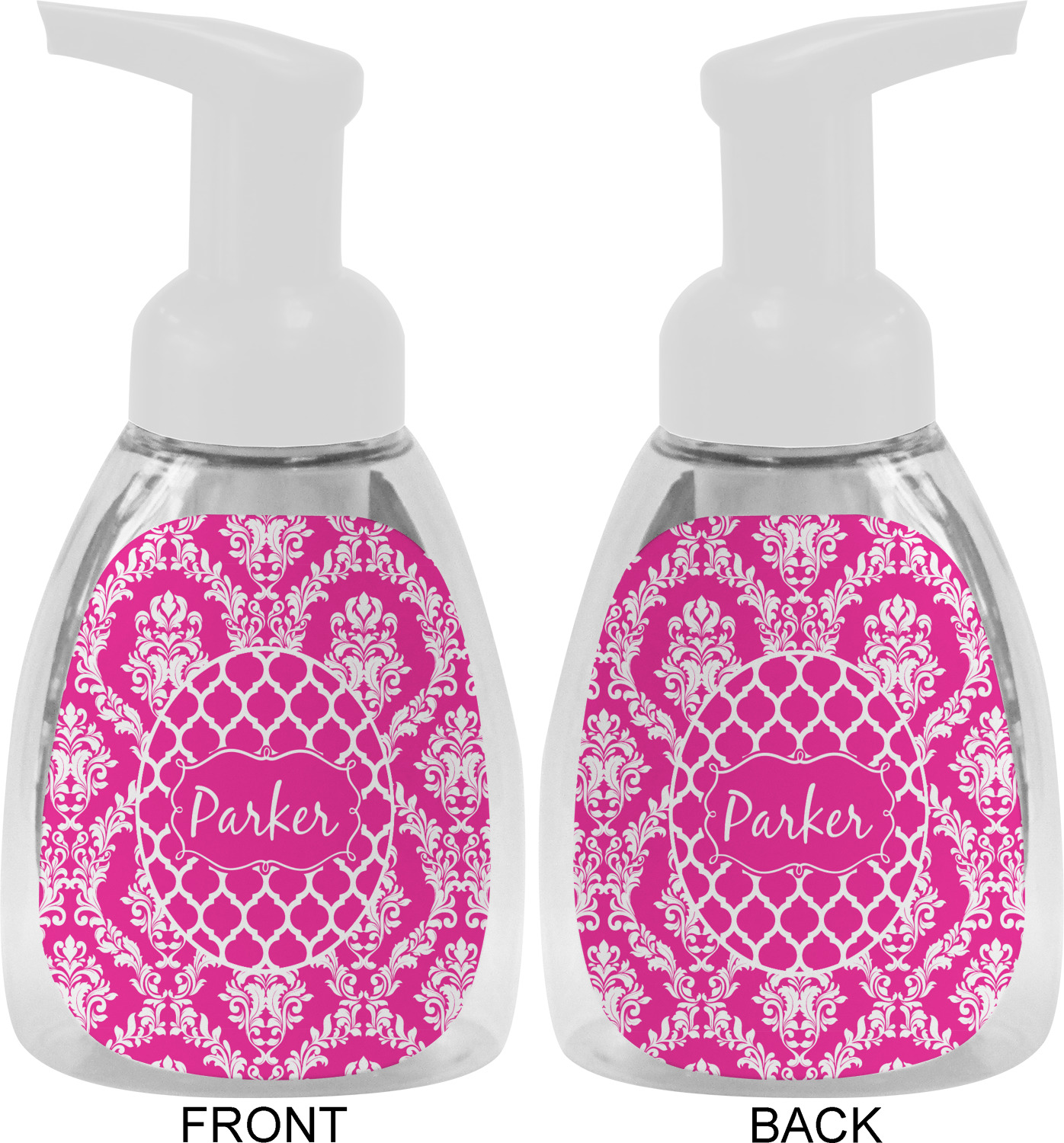 This soap dispenser is made of a robust plastic and has a clear base. The included soap pump is available in black or white color. This dispenser is 6.5 inches tall, 3 inches wide, and 2 inches deep. We display your customized designs on the front and back sides of these foaming hand soap dispensers.