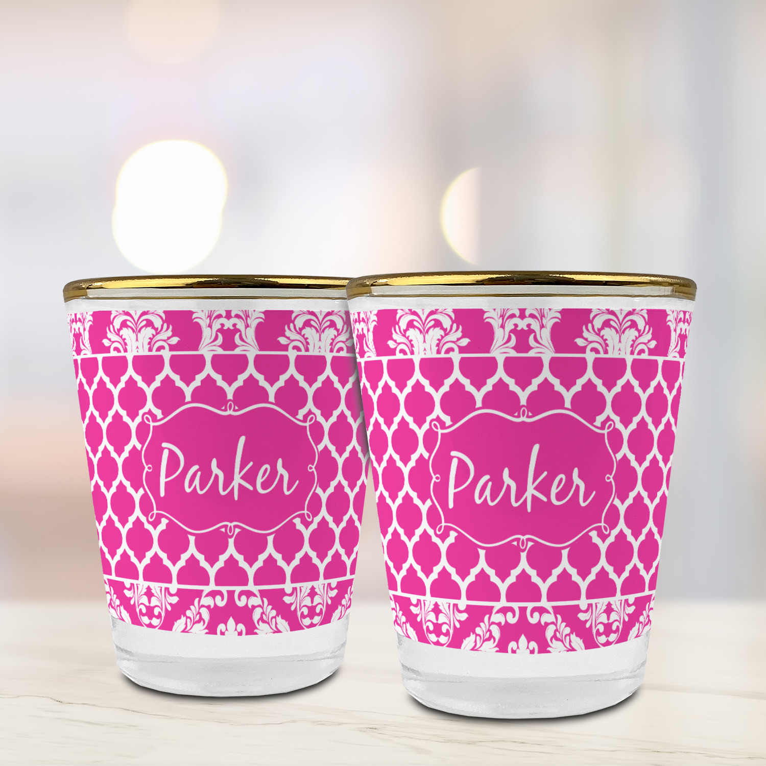 This is one of our new concentric design style - where you can use any two patterns together - we have chose to feature our damask and moroccan / trellis patterns. We chose our hot pink and white for our colors and curlz label with a name for personalization.