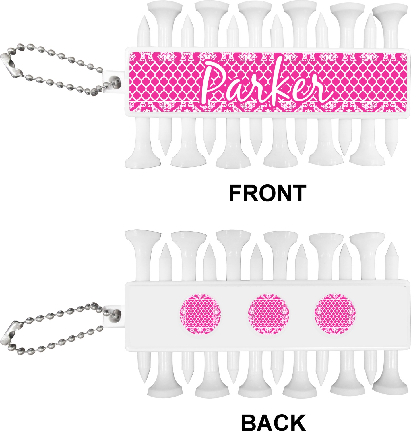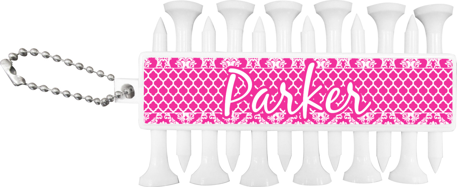 This is one of our new concentric design style - where you can use any two patterns together - we have chose to feature our damask and moroccan / trellis patterns. We chose our hot pink and white for our colors and curlz label with a name for personalization.