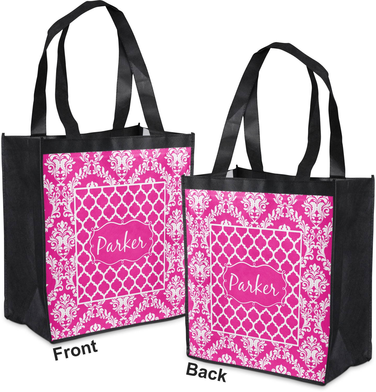 Made from a durable, biodegradable material, these reusable shopping bags can support up to 30 pounds of weight. With two large handles, measuring at 8.5 inches each, these personalized tote bags are easy to carry to your vehicle or home. The bag itself is 12 by 13.5 inches, and can expand to a depth of 7 inches. Your customization is printed on both the front and back, while the remaining sides, trim, and handle are a sleek, charcoal black.