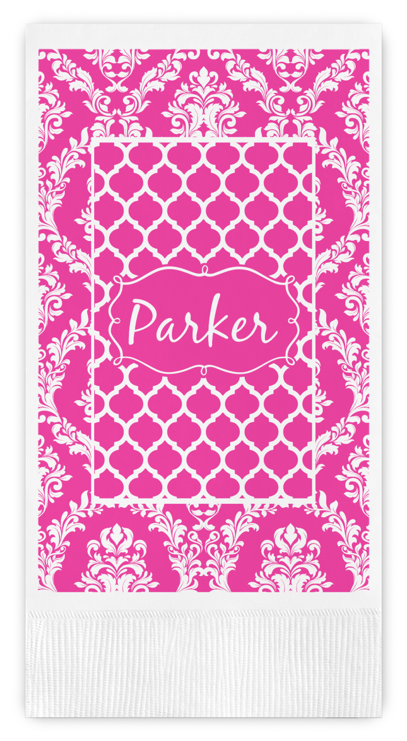 This is one of our new concentric design style - where you can use any two patterns together - we have chose to feature our damask and moroccan / trellis patterns. We chose our hot pink and white for our colors and curlz label with a name for personalization.