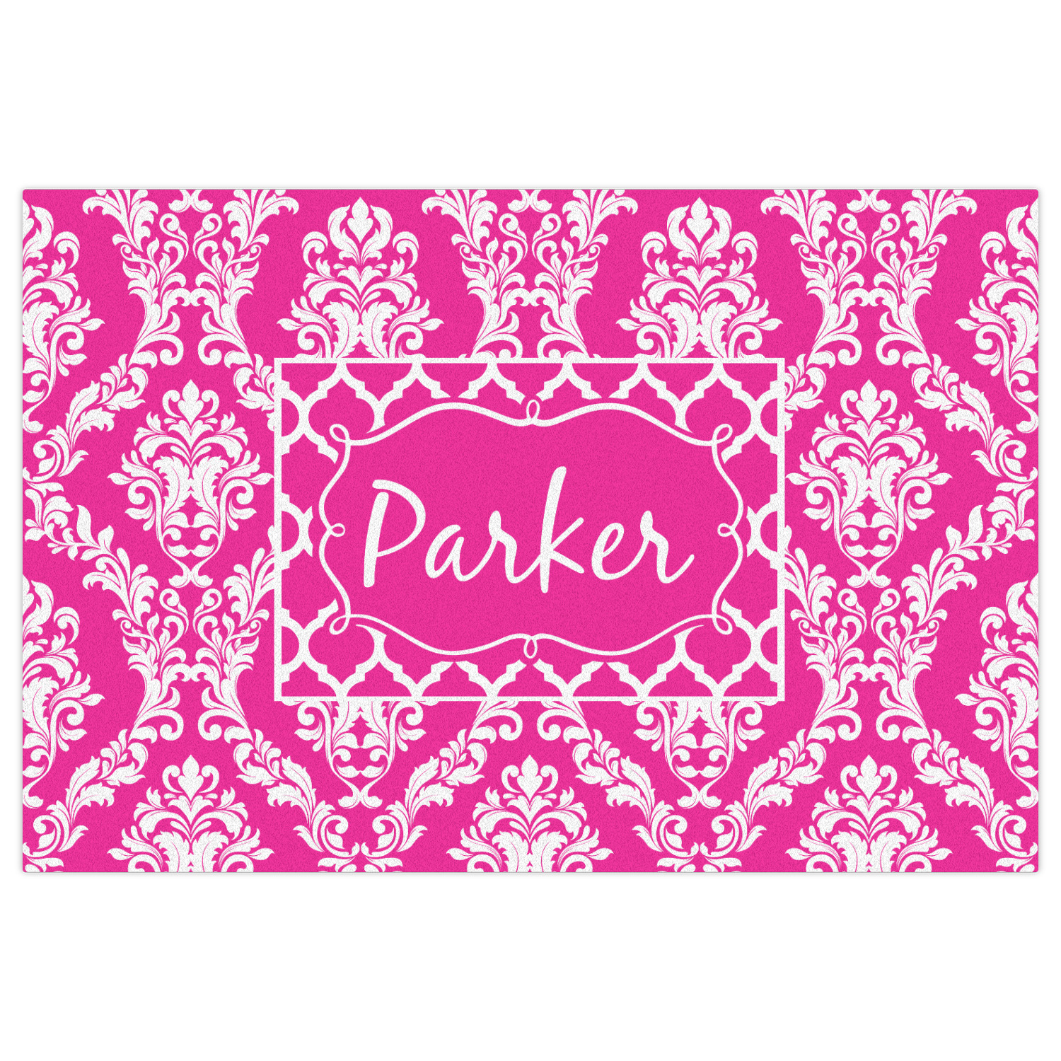 This is one of our new concentric design style - where you can use any two patterns together - we have chose to feature our damask and moroccan / trellis patterns. We chose our hot pink and white for our colors and curlz label with a name for personalization.