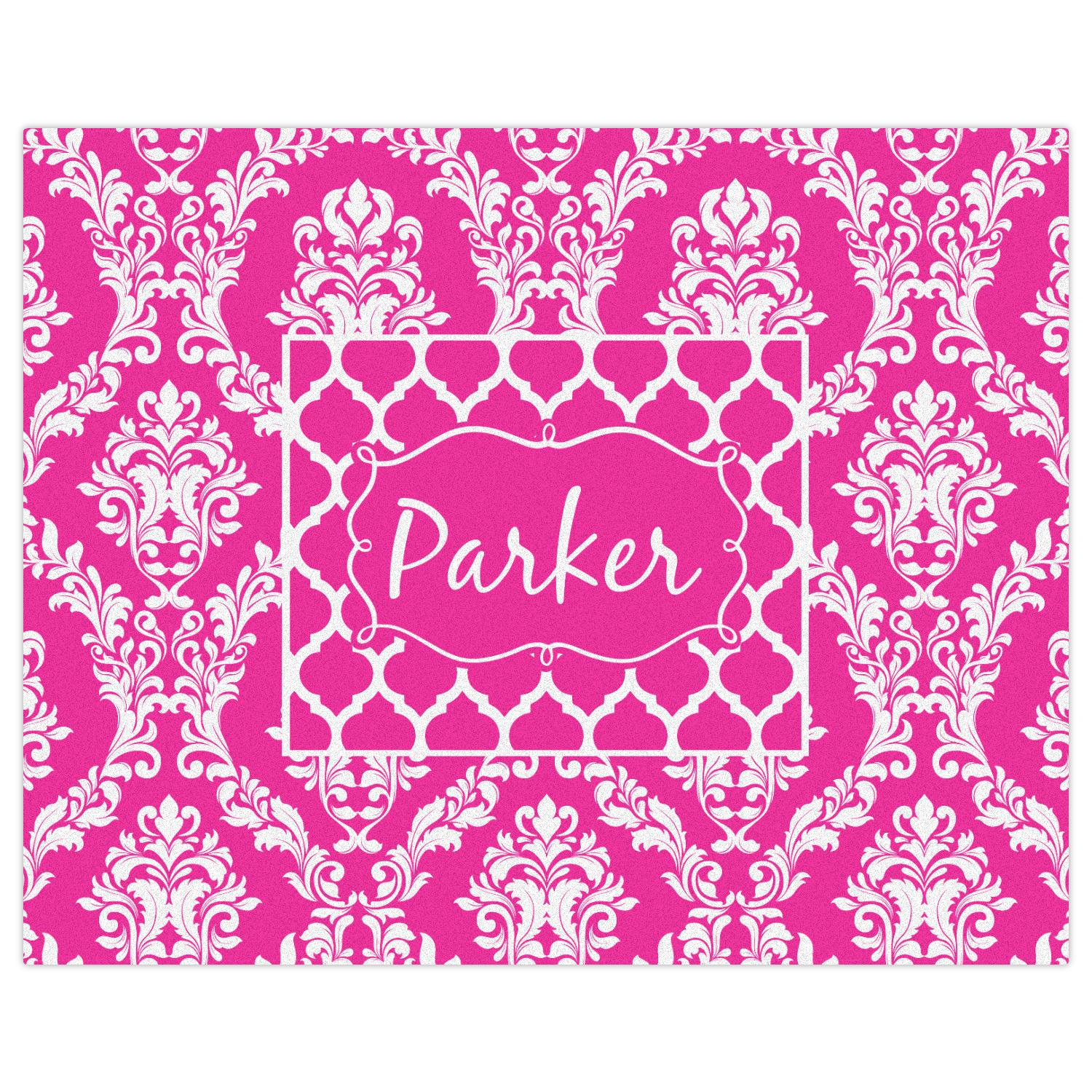 This is one of our new concentric design style - where you can use any two patterns together - we have chose to feature our damask and moroccan / trellis patterns. We chose our hot pink and white for our colors and curlz label with a name for personalization.
