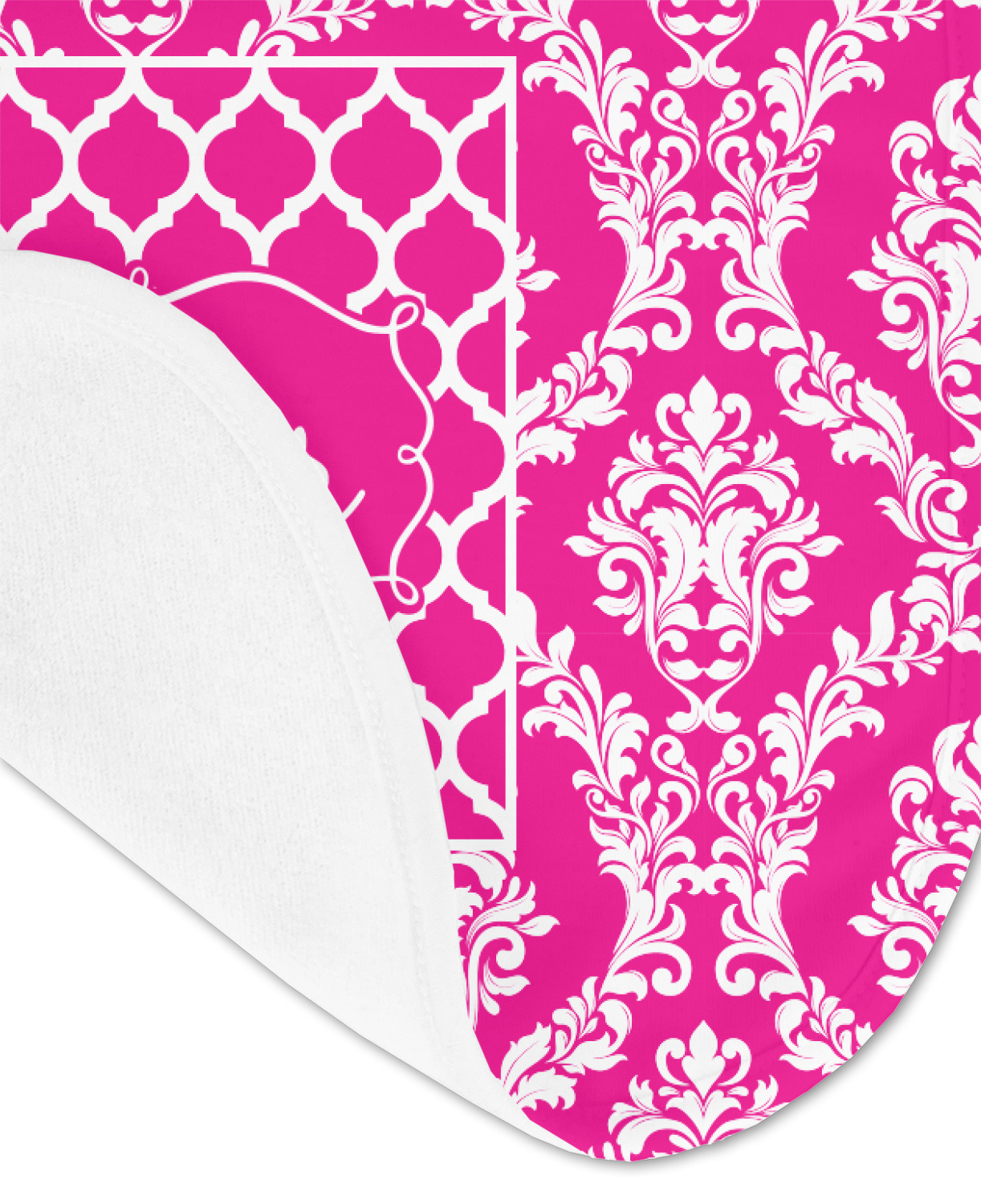 This is one of our new concentric design style - where you can use any two patterns together - we have chose to feature our damask and moroccan / trellis patterns. We chose our hot pink and white for our colors and curlz label with a name for personalization.