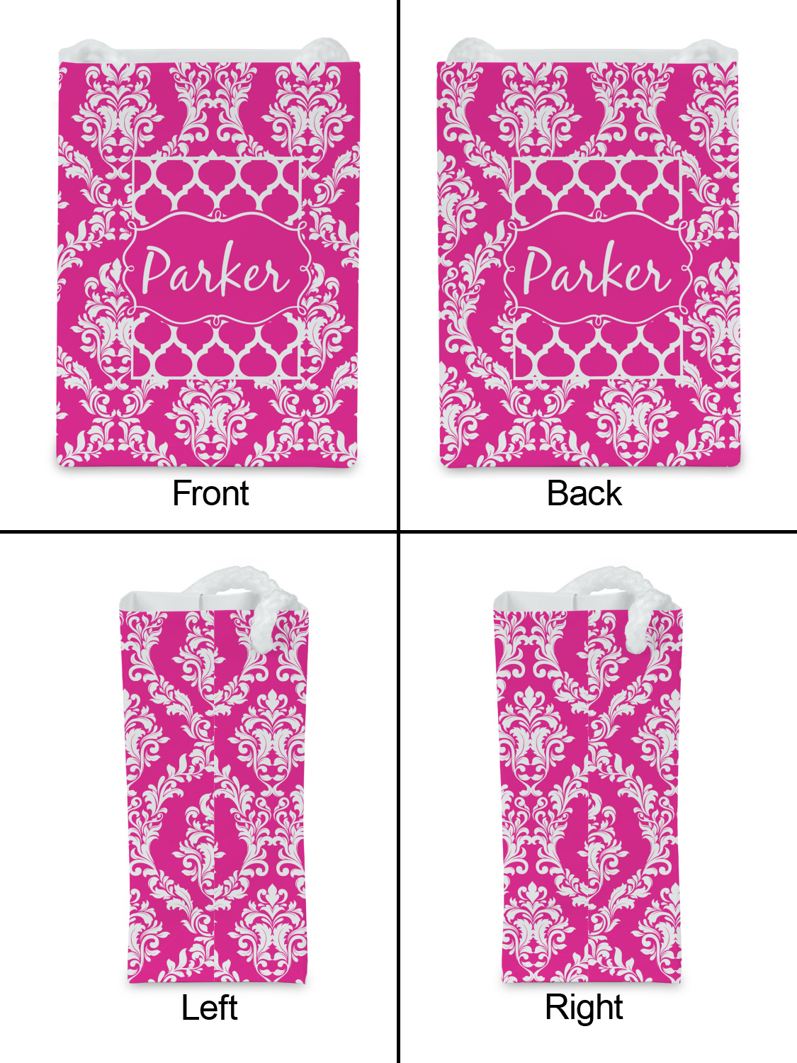 This is one of our new concentric design style - where you can use any two patterns together - we have chose to feature our damask and moroccan / trellis patterns. We chose our hot pink and white for our colors and curlz label with a name for personalization.