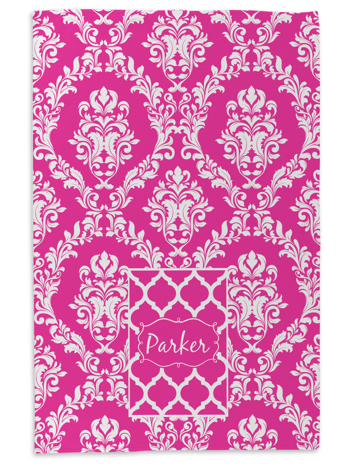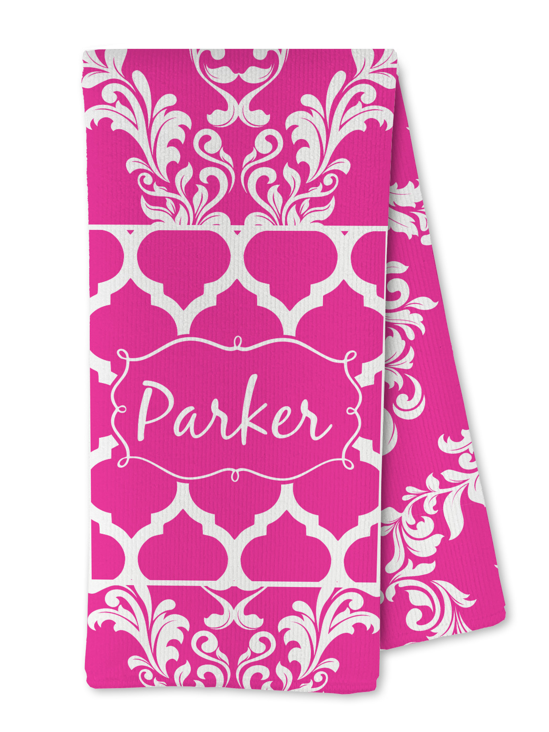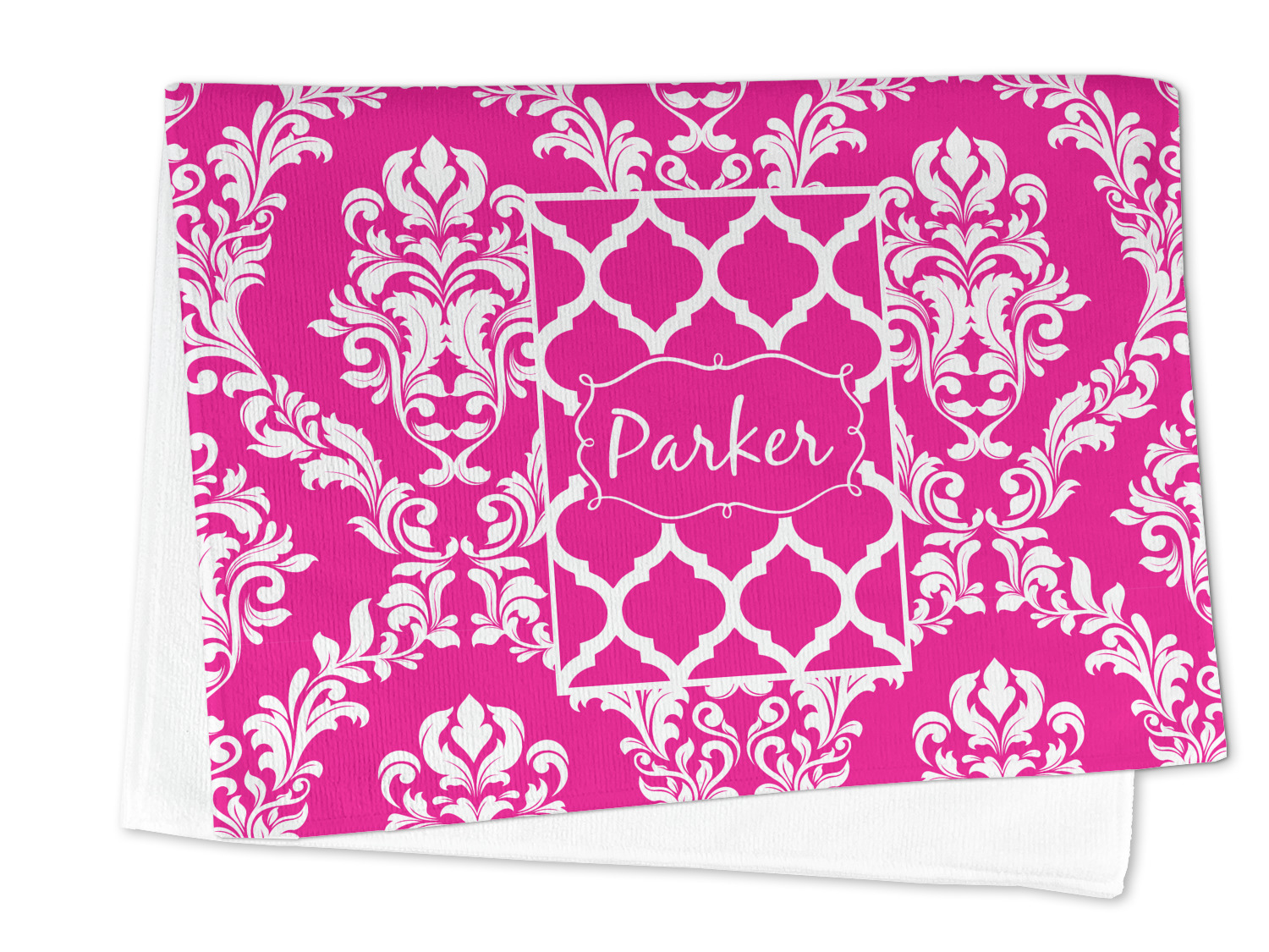 This is one of our new concentric design style - where you can use any two patterns together - we have chose to feature our damask and moroccan / trellis patterns. We chose our hot pink and white for our colors and curlz label with a name for personalization.