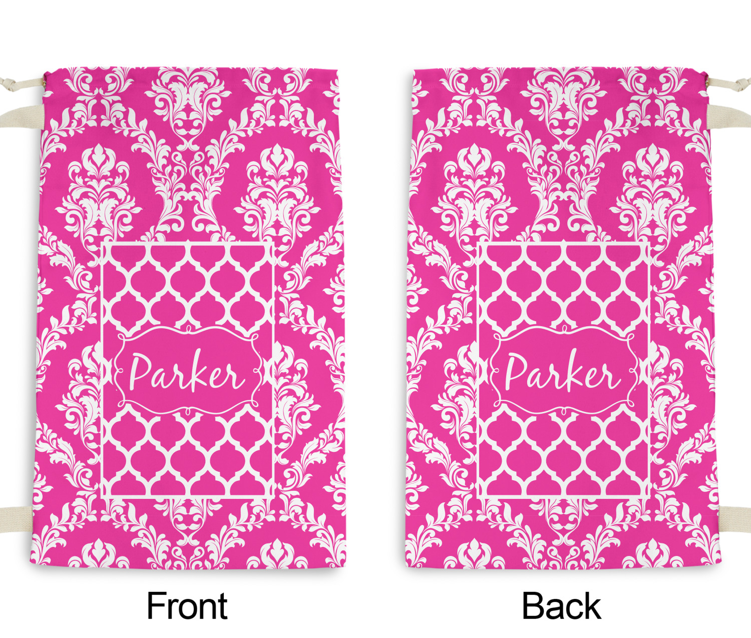 This is one of our new concentric design style - where you can use any two patterns together - we have chose to feature our damask and moroccan / trellis patterns. We chose our hot pink and white for our colors and curlz label with a name for personalization.