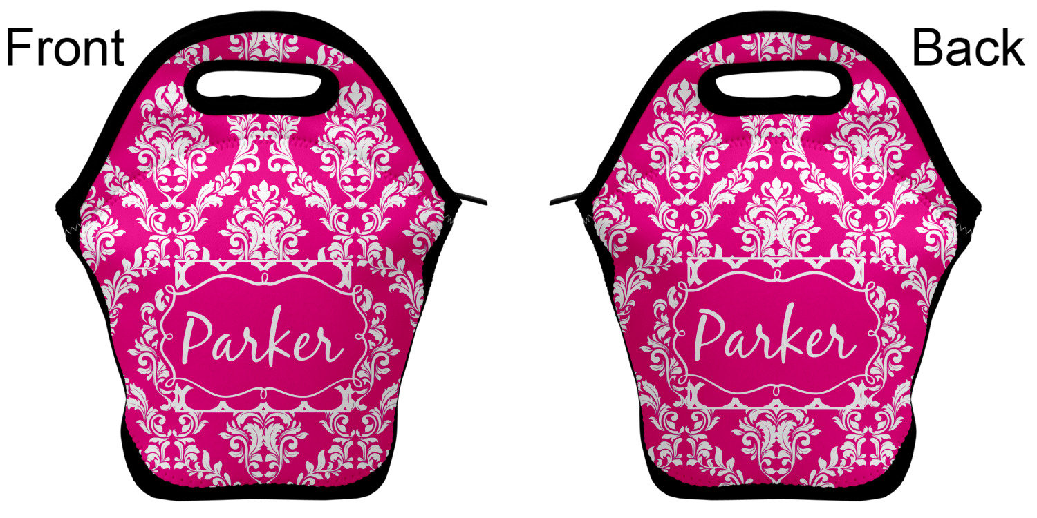 Our personalized lunch bags are made from a strong neoprene, and secure with a zipper closure that lines the top of the bag.The edges of the neoprene are sewn together with a heavy duty stitch, adding to the durability of the bag. The is accompanied by a reinforced handle at its top, for the easy transport of your lunch. We display your personalization across both the front and back of this neoprene lunch bag, while the remaining sides are a sleek black in color. Each bag measures at 13.5 inches tall, and 11.5 inches wide.