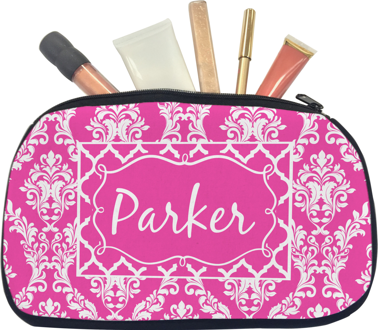 Our personalized makeup bags are available in many different designs, patterns and colors - so you are sure to find one that will love. They are made of neoprene (same material as wet-suits) and thus are water resistant, so spillages in your makeup bag will not end up all over you purse. They are customized on one side and are black on the other side and the zipper is black as well.