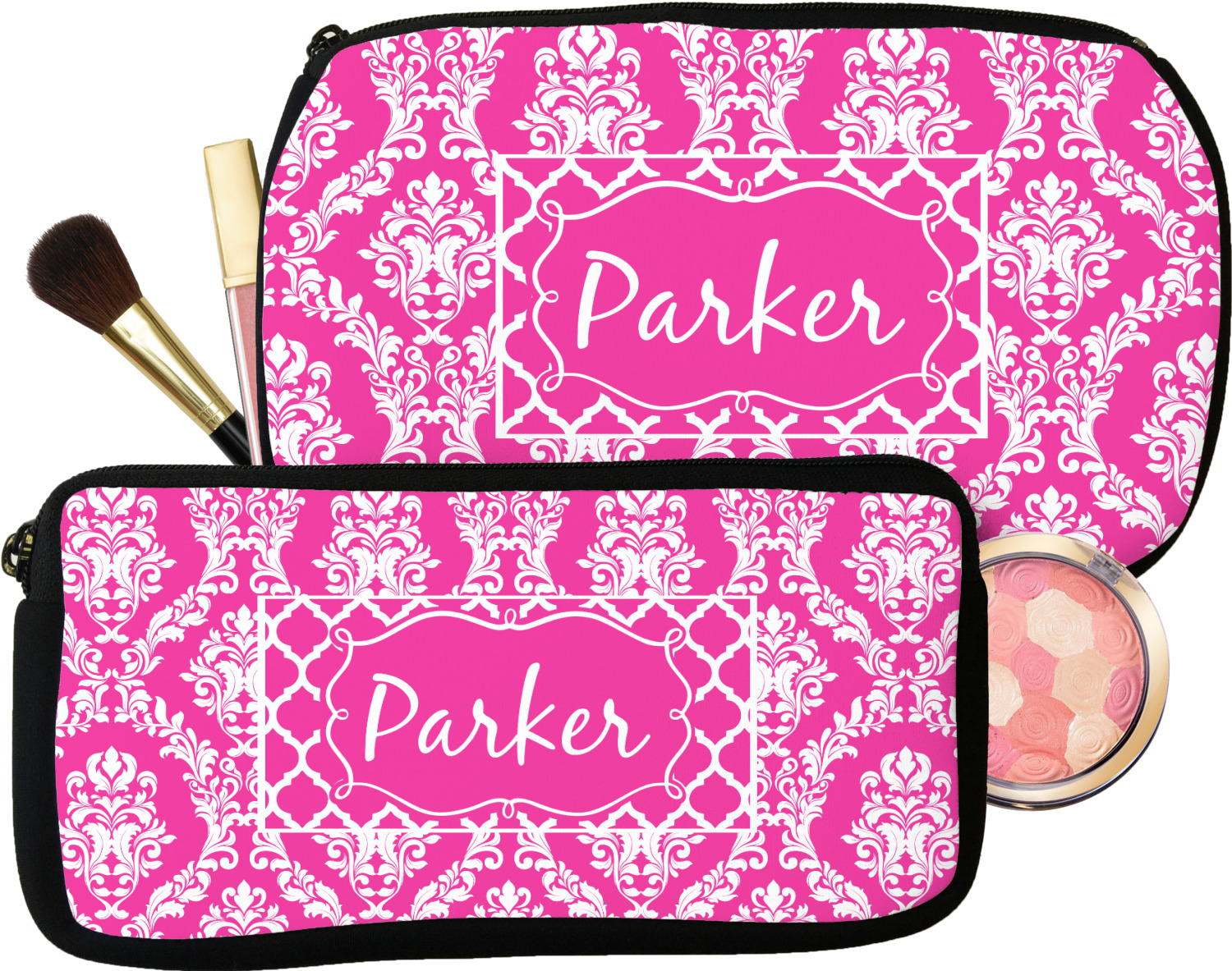 Our personalized makeup bags are available in many different designs, patterns and colors - so you are sure to find one that will love. They are made of neoprene (same material as wet-suits) and thus are water resistant, so spillages in your makeup bag will not end up all over you purse. They are customized on one side and are black on the other side and the zipper is black as well.