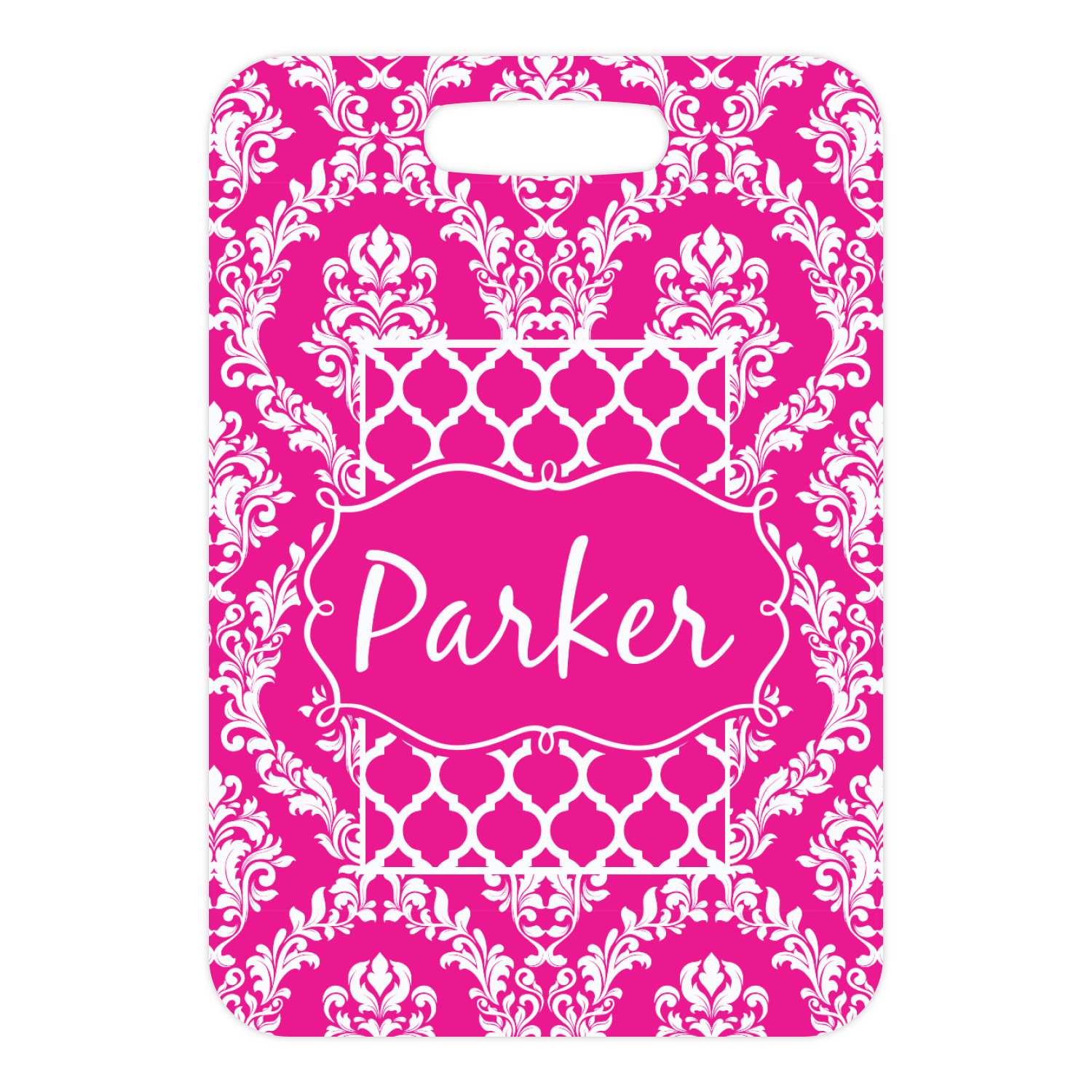 This is one of our new concentric design style - where you can use any two patterns together - we have chose to feature our damask and moroccan / trellis patterns. We chose our hot pink and white for our colors and curlz label with a name for personalization.
