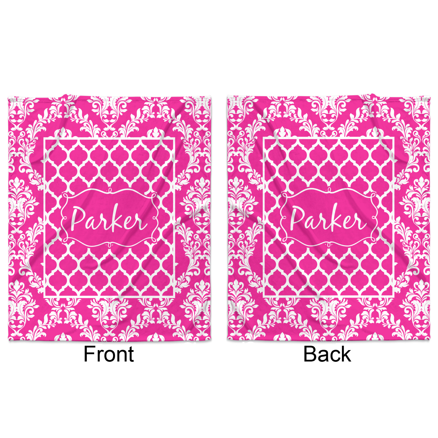 This is one of our new concentric design style - where you can use any two patterns together - we have chose to feature our damask and moroccan / trellis patterns. We chose our hot pink and white for our colors and curlz label with a name for personalization.