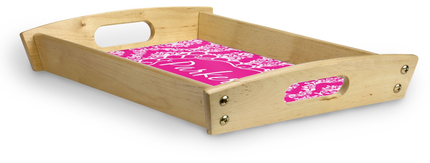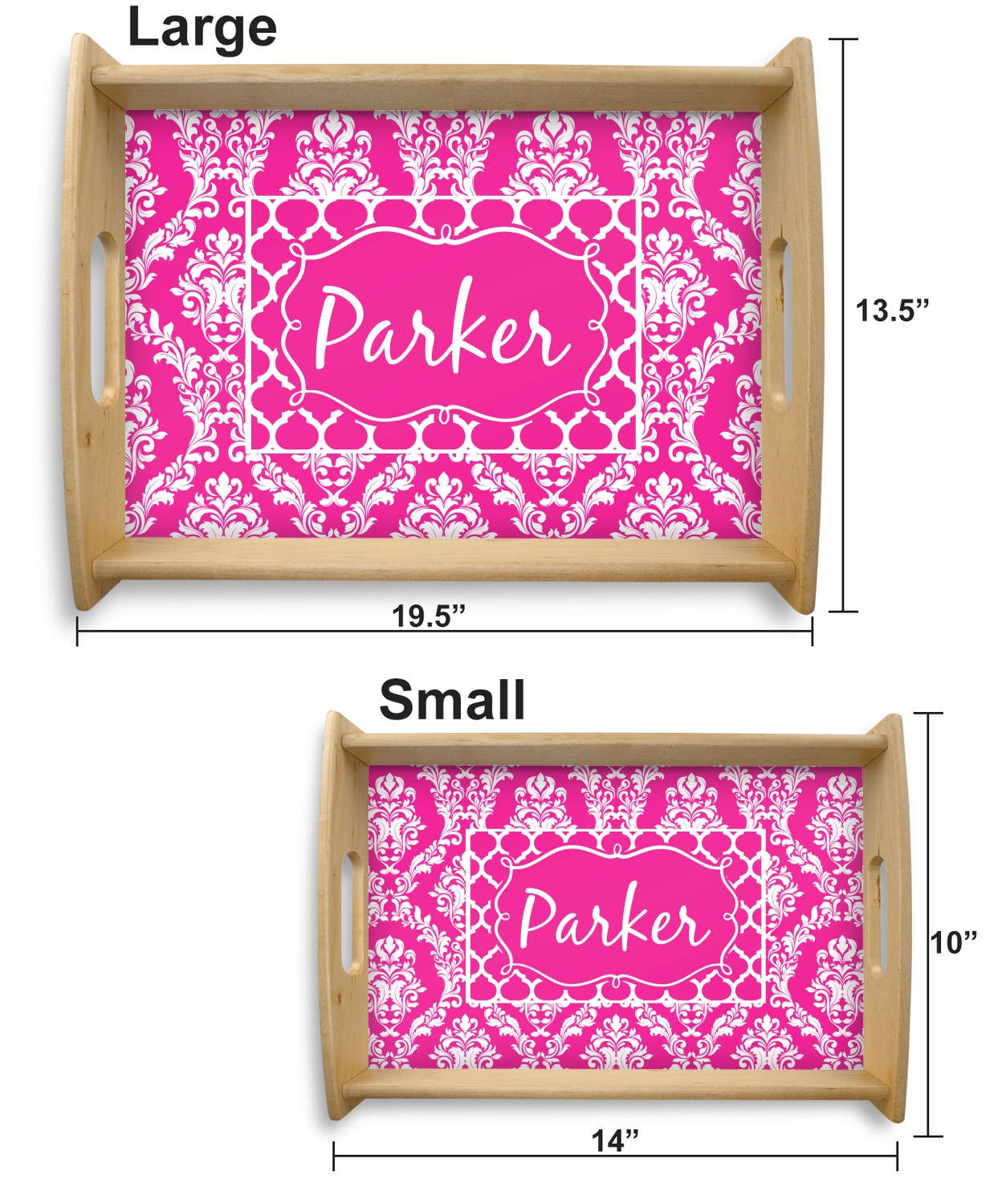 This serving tray with handles features square edges and two rounded sides, creating a very modern look. Each side is fabricated from a beautifully cut, natural wood. The bottom of the interior of the tray displays your customized design in bright, vibrant color. The tray is sold in both a black color and a natural wood look. Each variation of the wood serving tray has two sizes: Small, which is 14" x 10" x 2.25", and Large, which is 19.5" x 13.5" x 2.75".
