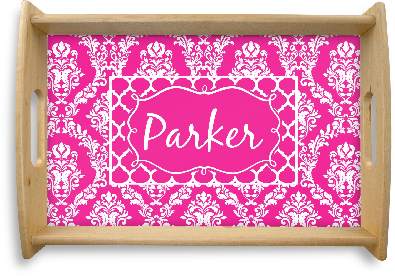 This is one of our new concentric design style - where you can use any two patterns together - we have chose to feature our damask and moroccan / trellis patterns. We chose our hot pink and white for our colors and curlz label with a name for personalization.