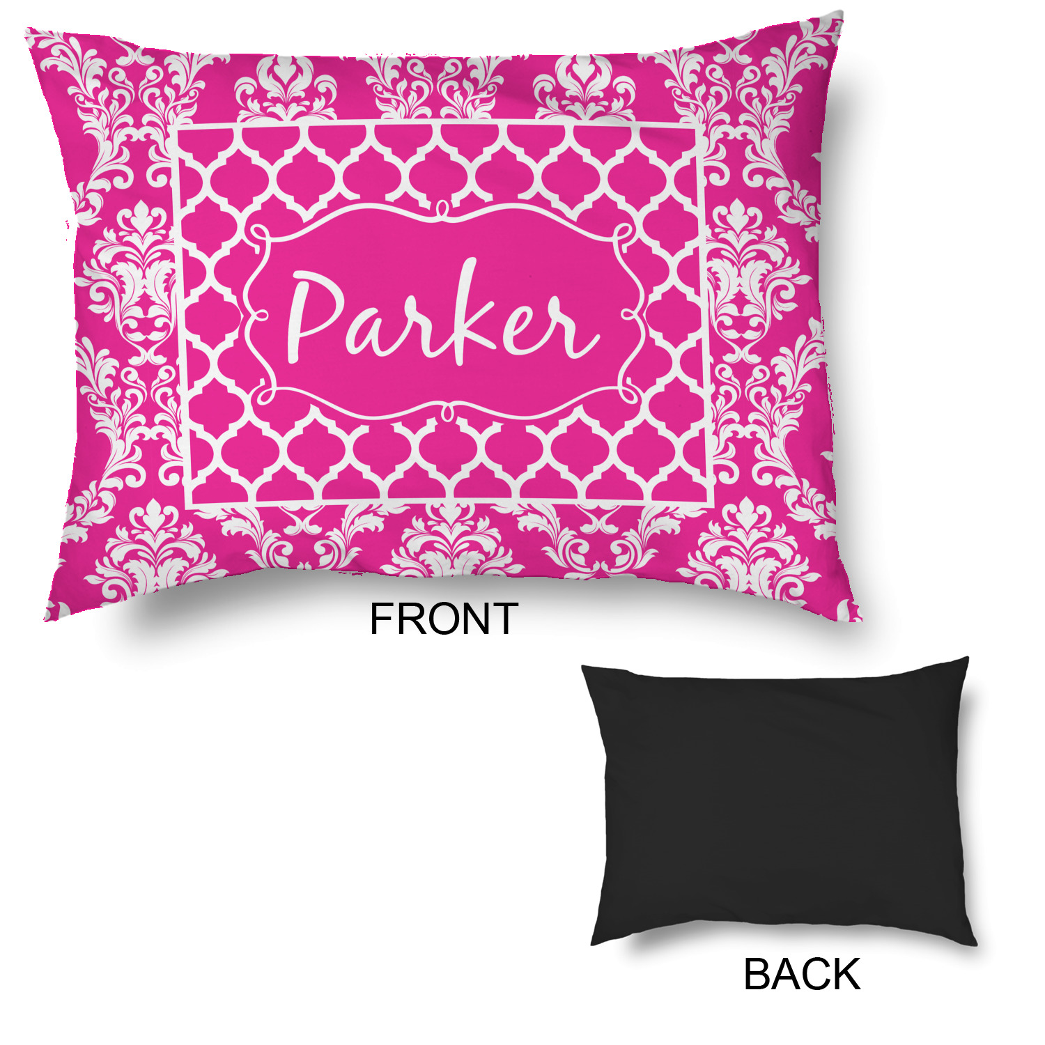 This is one of our new concentric design style - where you can use any two patterns together - we have chose to feature our damask and moroccan / trellis patterns. We chose our hot pink and white for our colors and curlz label with a name for personalization.