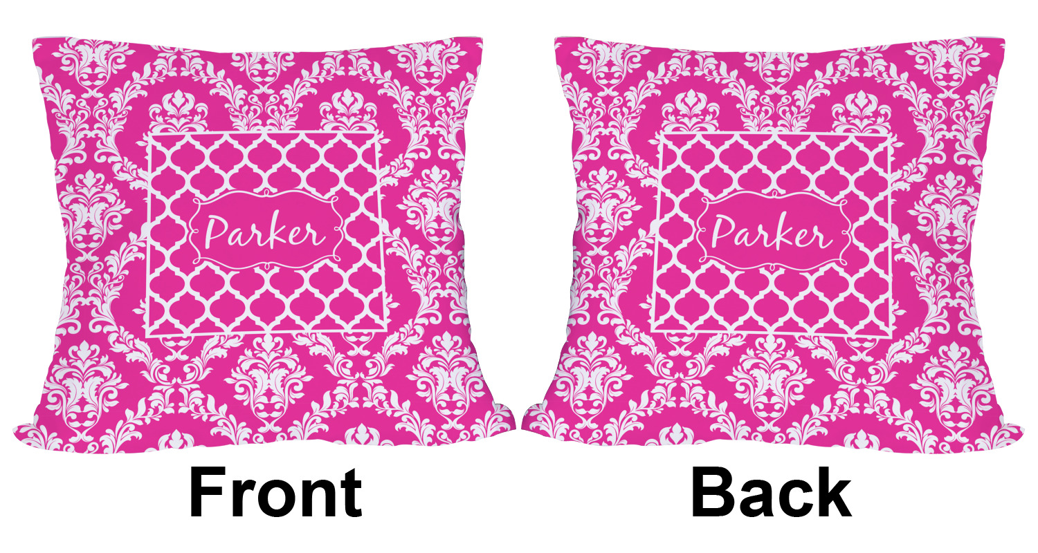 This is one of our new concentric design style - where you can use any two patterns together - we have chose to feature our damask and moroccan / trellis patterns. We chose our hot pink and white for our colors and curlz label with a name for personalization.