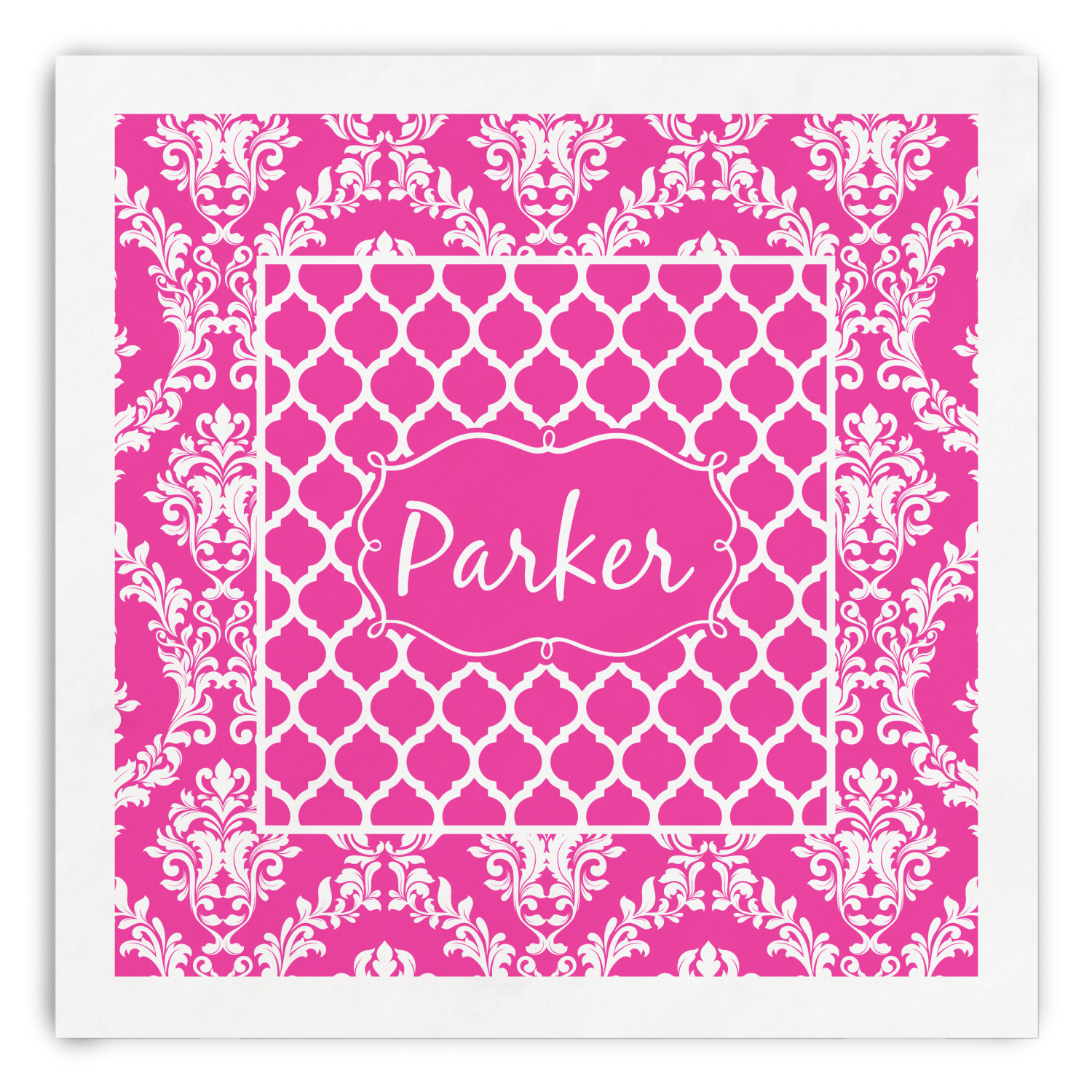 This is one of our new concentric design style - where you can use any two patterns together - we have chose to feature our damask and moroccan / trellis patterns. We chose our hot pink and white for our colors and curlz label with a name for personalization.