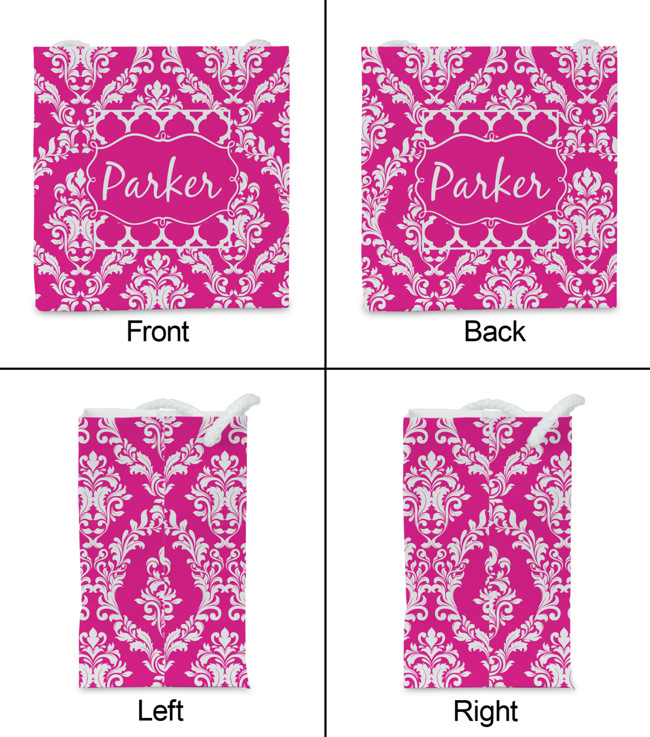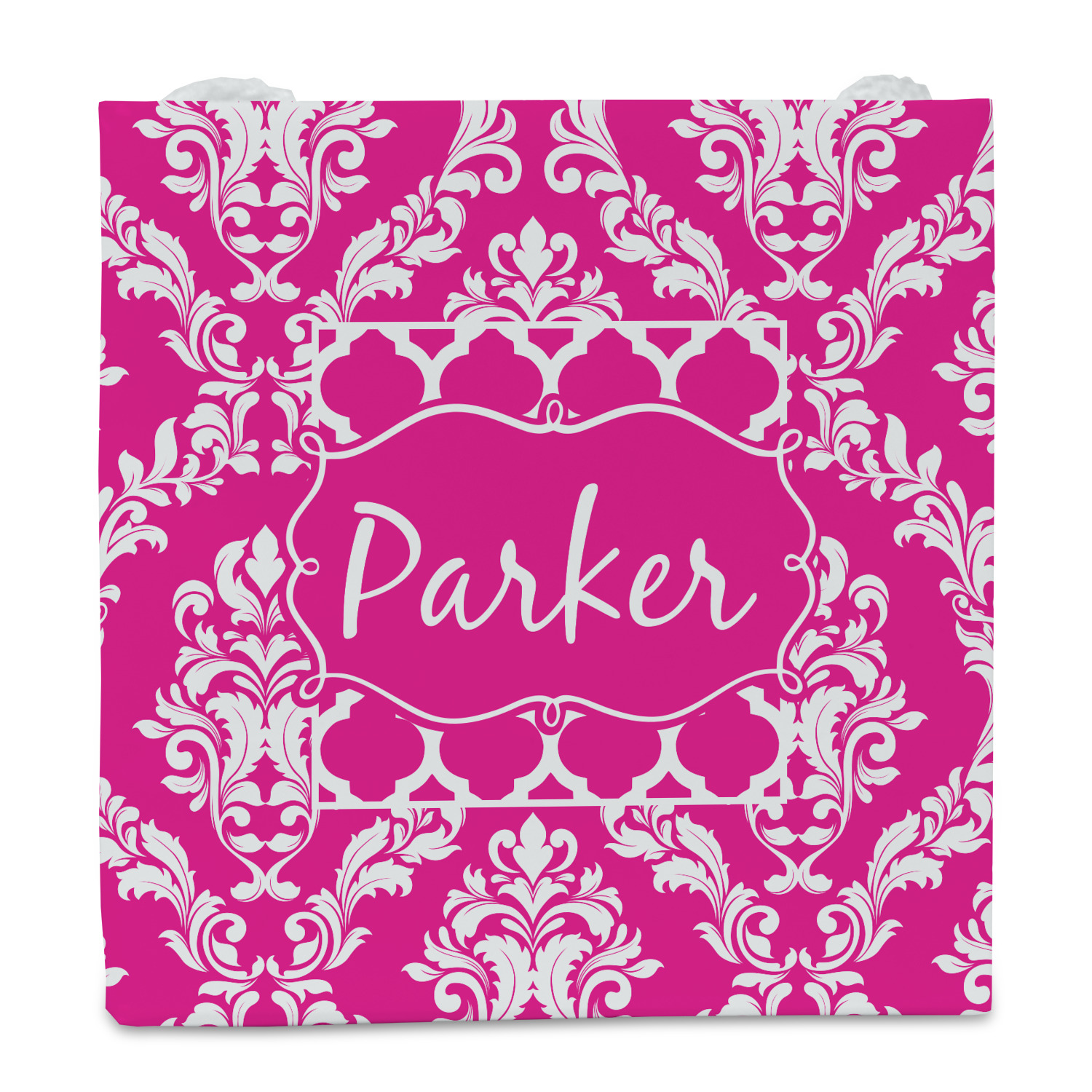 This is one of our new concentric design style - where you can use any two patterns together - we have chose to feature our damask and moroccan / trellis patterns. We chose our hot pink and white for our colors and curlz label with a name for personalization.
