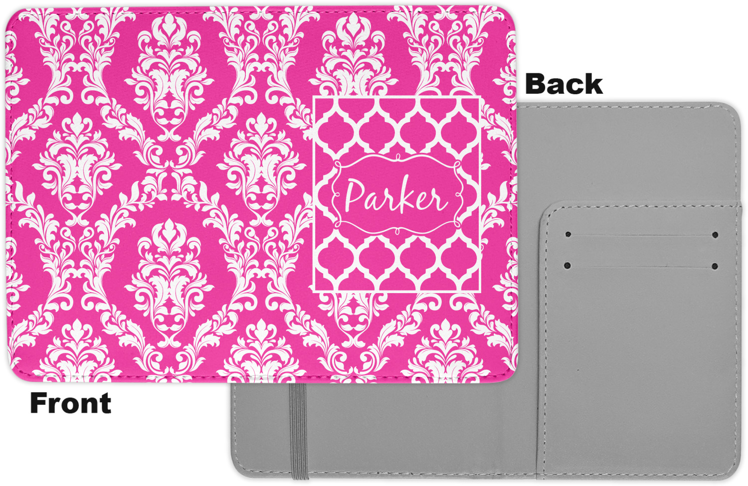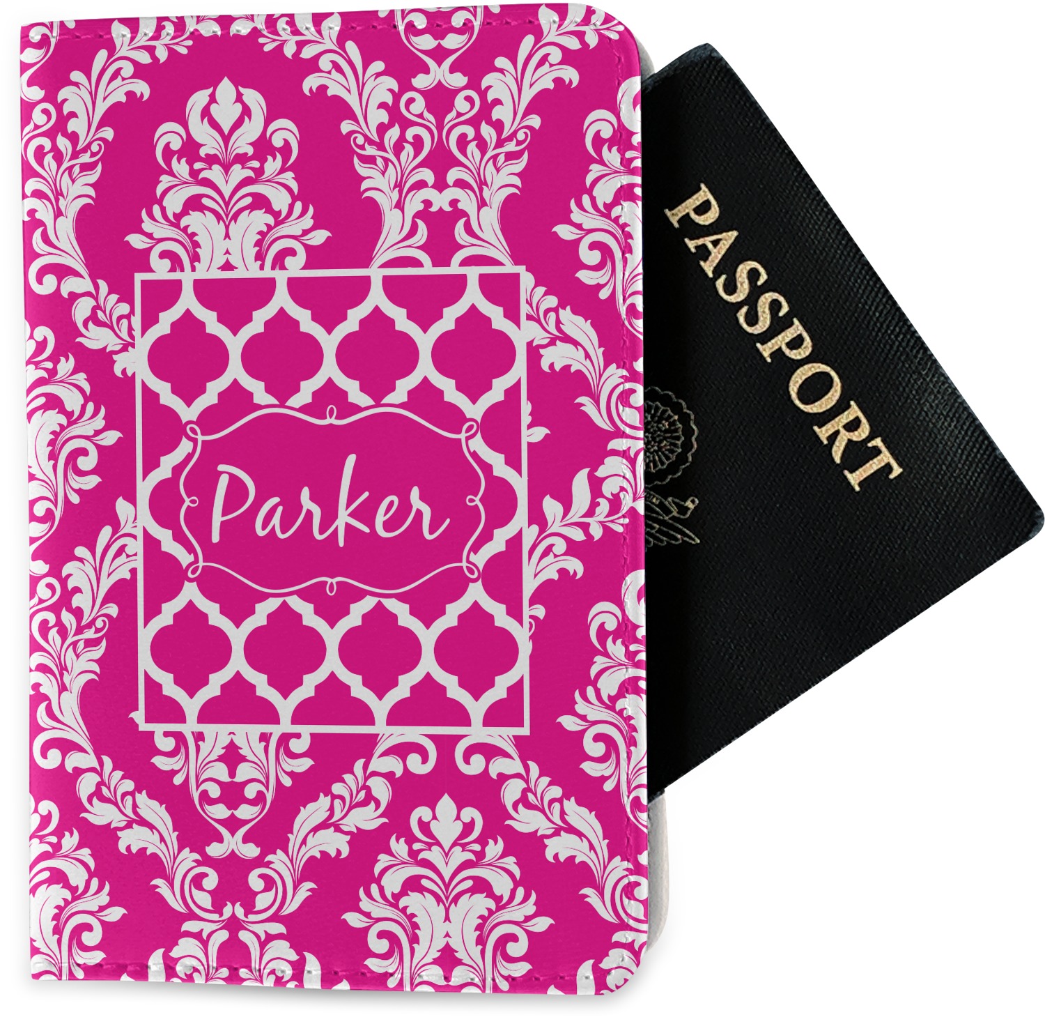 The passport holder has a beautiful inside made of faux leather, while the outside is a smooth slick vinyl like material printed with your personal design.