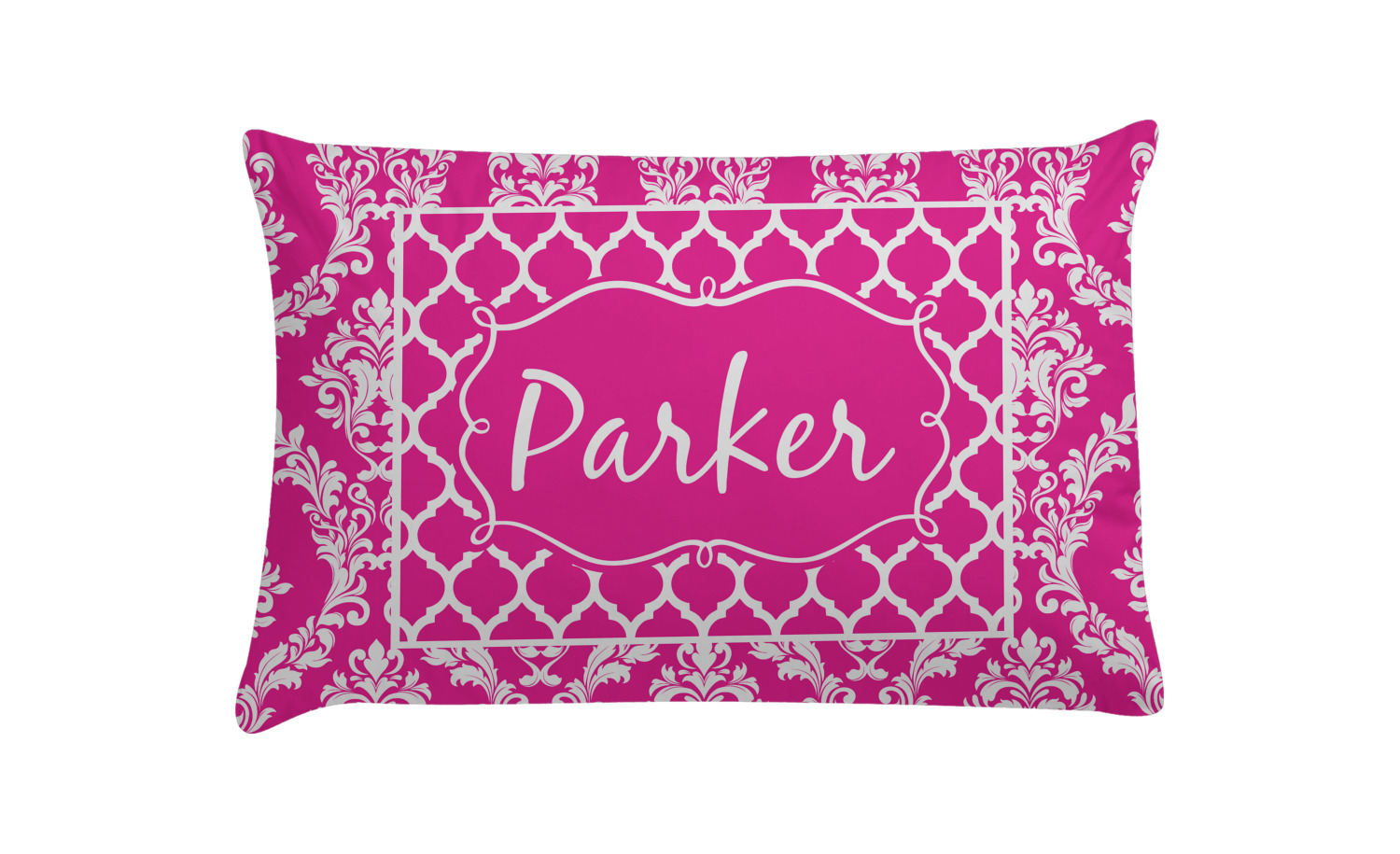 This is one of our new concentric design style - where you can use any two patterns together - we have chose to feature our damask and moroccan / trellis patterns. We chose our hot pink and white for our colors and curlz label with a name for personalization.