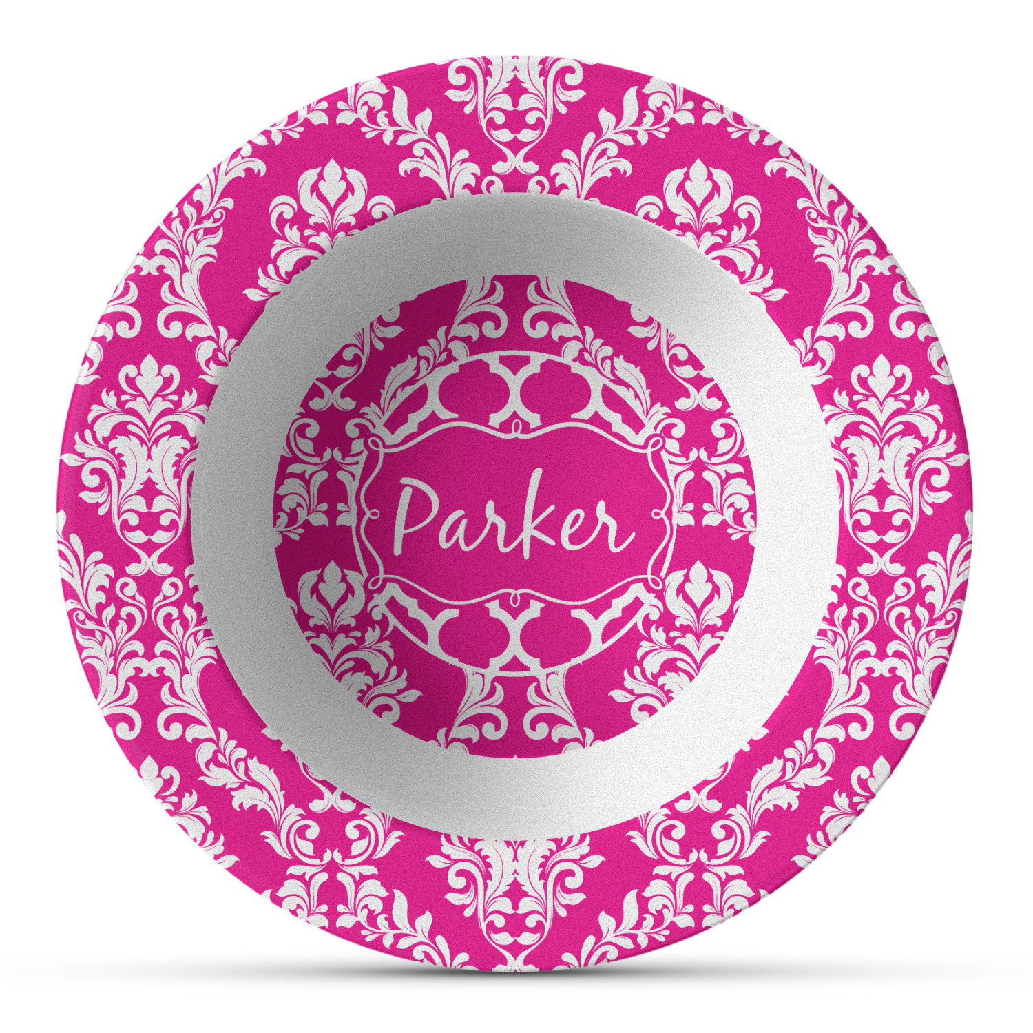 This is one of our new concentric design style - where you can use any two patterns together - we have chose to feature our damask and moroccan / trellis patterns. We chose our hot pink and white for our colors and curlz label with a name for personalization.