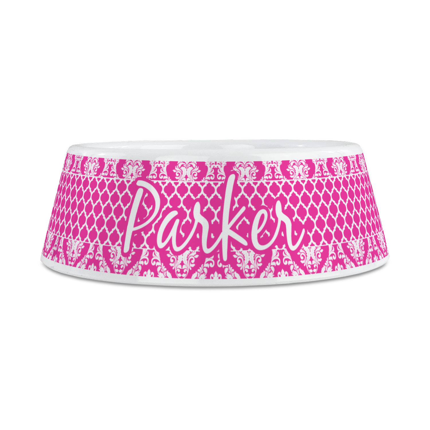 This is one of our new concentric design style - where you can use any two patterns together - we have chose to feature our damask and moroccan / trellis patterns. We chose our hot pink and white for our colors and curlz label with a name for personalization.