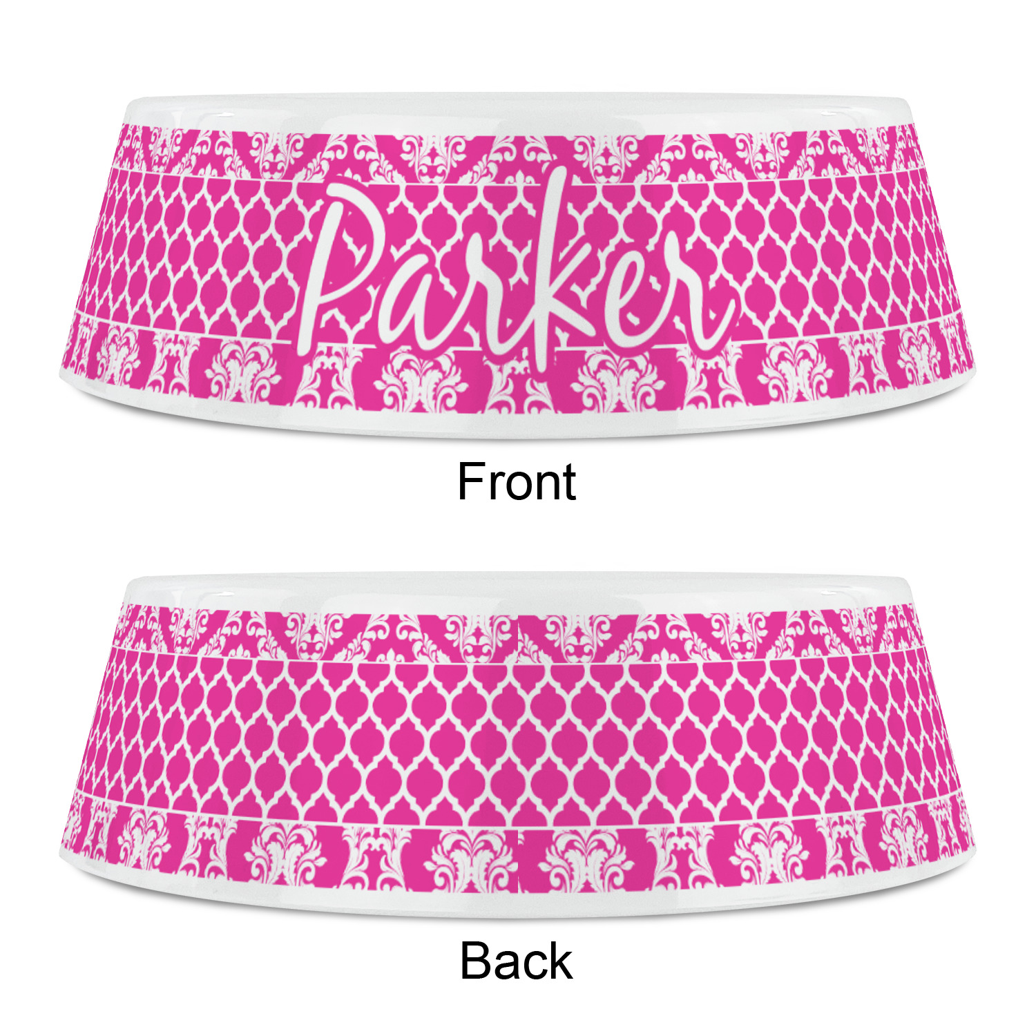 This is one of our new concentric design style - where you can use any two patterns together - we have chose to feature our damask and moroccan / trellis patterns. We chose our hot pink and white for our colors and curlz label with a name for personalization.