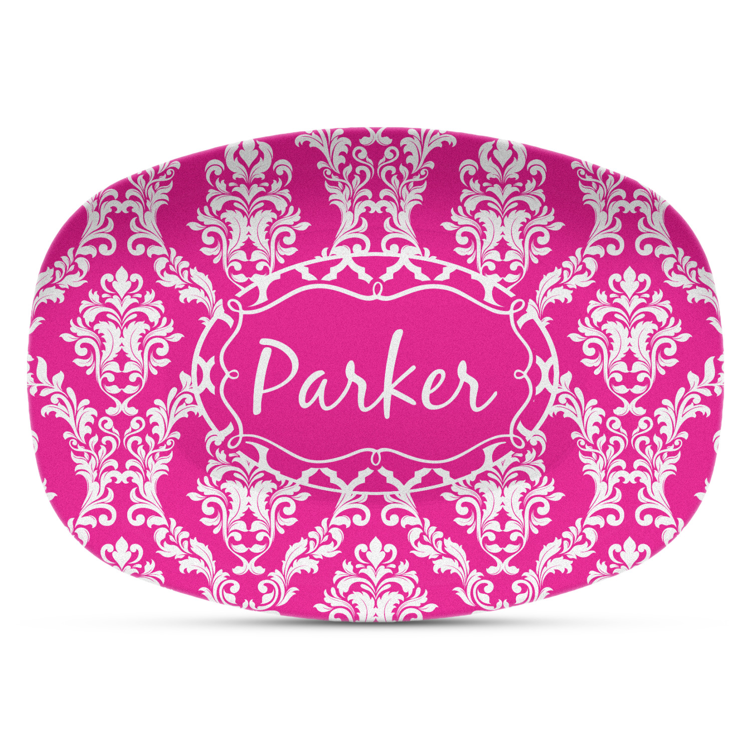 This is one of our new concentric design style - where you can use any two patterns together - we have chose to feature our damask and moroccan / trellis patterns. We chose our hot pink and white for our colors and curlz label with a name for personalization.