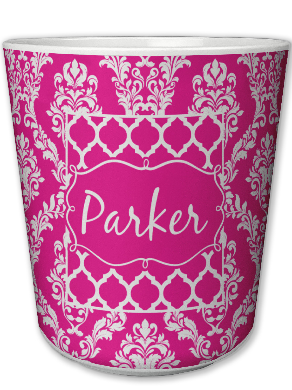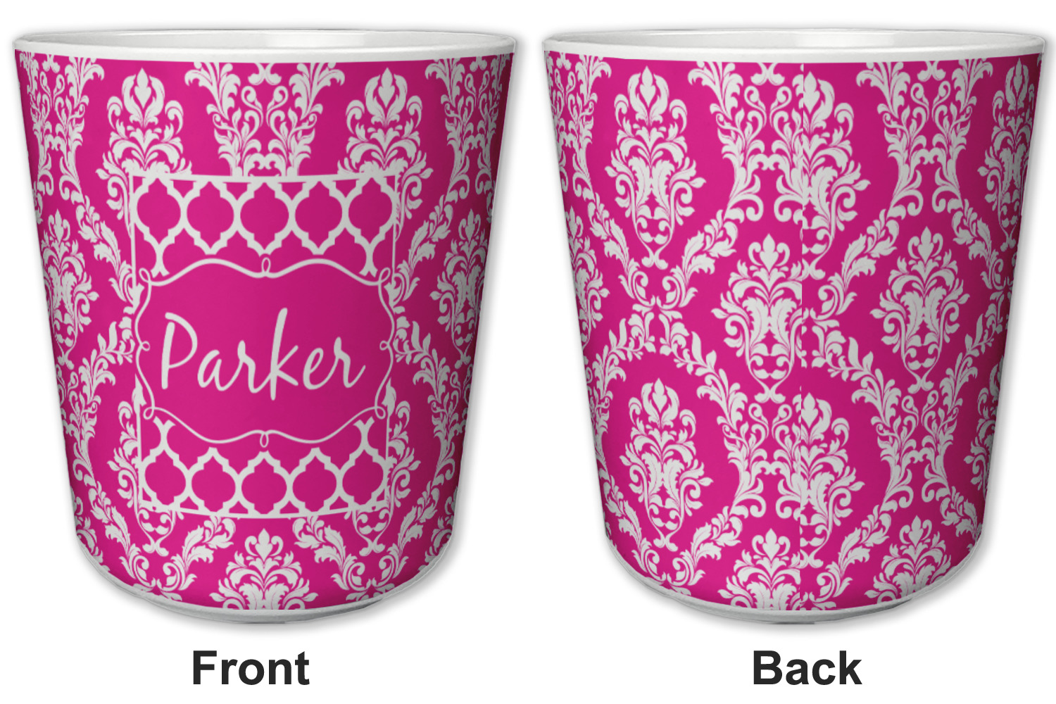 This is one of our new concentric design style - where you can use any two patterns together - we have chose to feature our damask and moroccan / trellis patterns. We chose our hot pink and white for our colors and curlz label with a name for personalization.