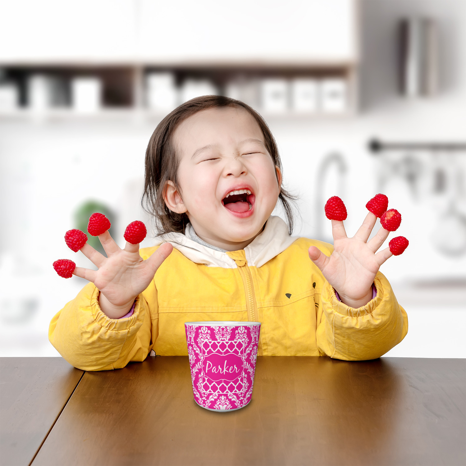 Made from a durable plastic, these tumbler cups are strong enough to withstand daily use and are perfect for young children. Each of these personalized plastic cups holds 6 ounces and measure at approximately 3" x 3" x 3.25". Place them in the bathroom as a rinsing cup, or give them to your kids during mealtimes. These 6 oz. plastic cups are BPA free, microwave and dishwasher safe, for your convenience. Your personalized design is displayed across the entire outside of this cup, while the inside is white in color to make your customization really stand out.
