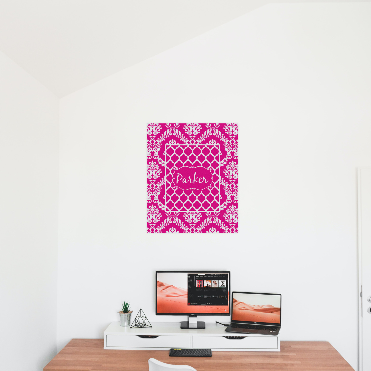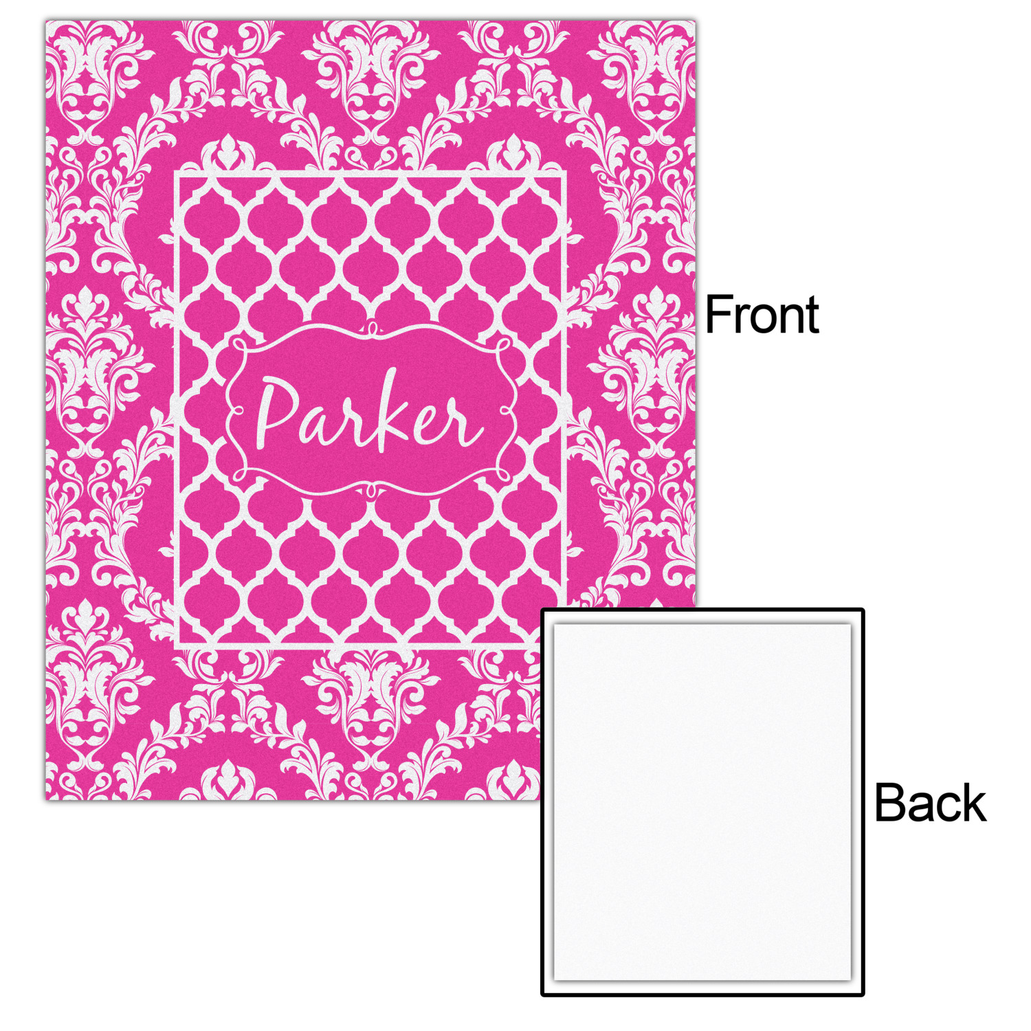 This is one of our new concentric design style - where you can use any two patterns together - we have chose to feature our damask and moroccan / trellis patterns. We chose our hot pink and white for our colors and curlz label with a name for personalization.