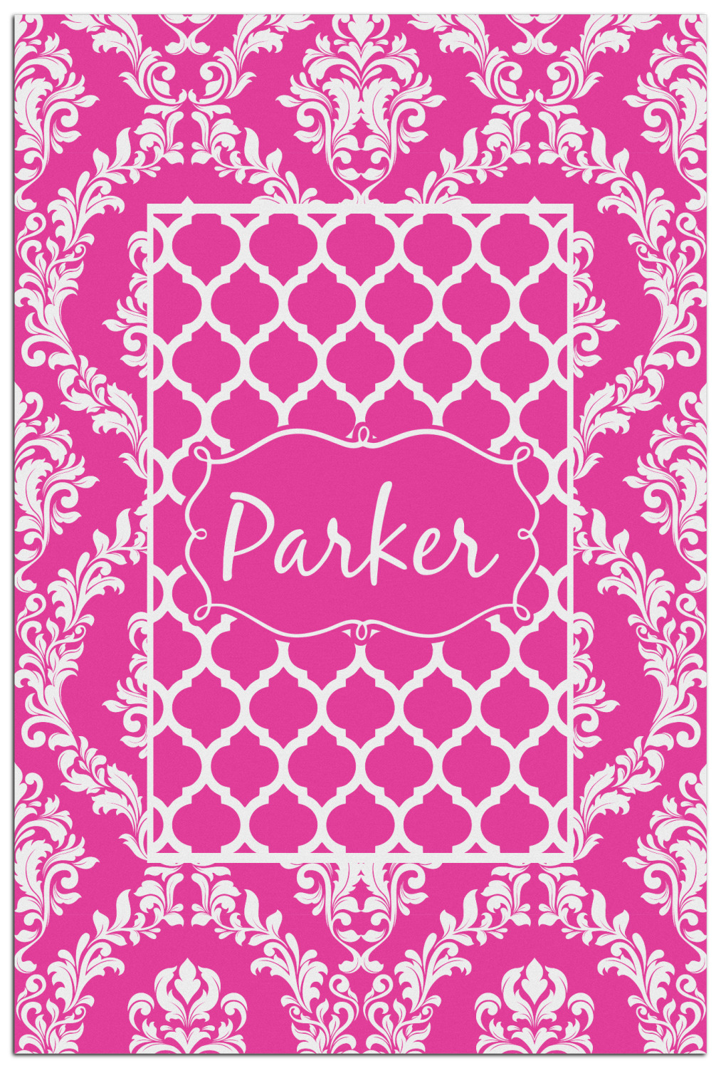 This is one of our new concentric design style - where you can use any two patterns together - we have chose to feature our damask and moroccan / trellis patterns. We chose our hot pink and white for our colors and curlz label with a name for personalization.