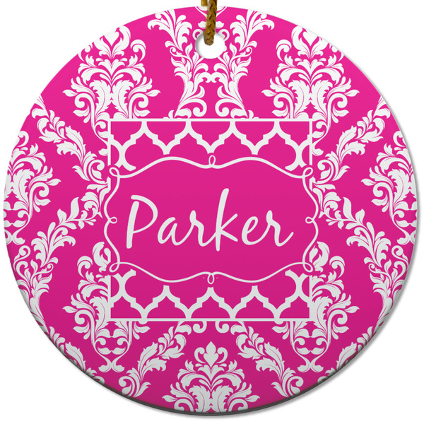 This is one of our new concentric design style - where you can use any two patterns together - we have chose to feature our damask and moroccan / trellis patterns. We chose our hot pink and white for our colors and curlz label with a name for personalization.