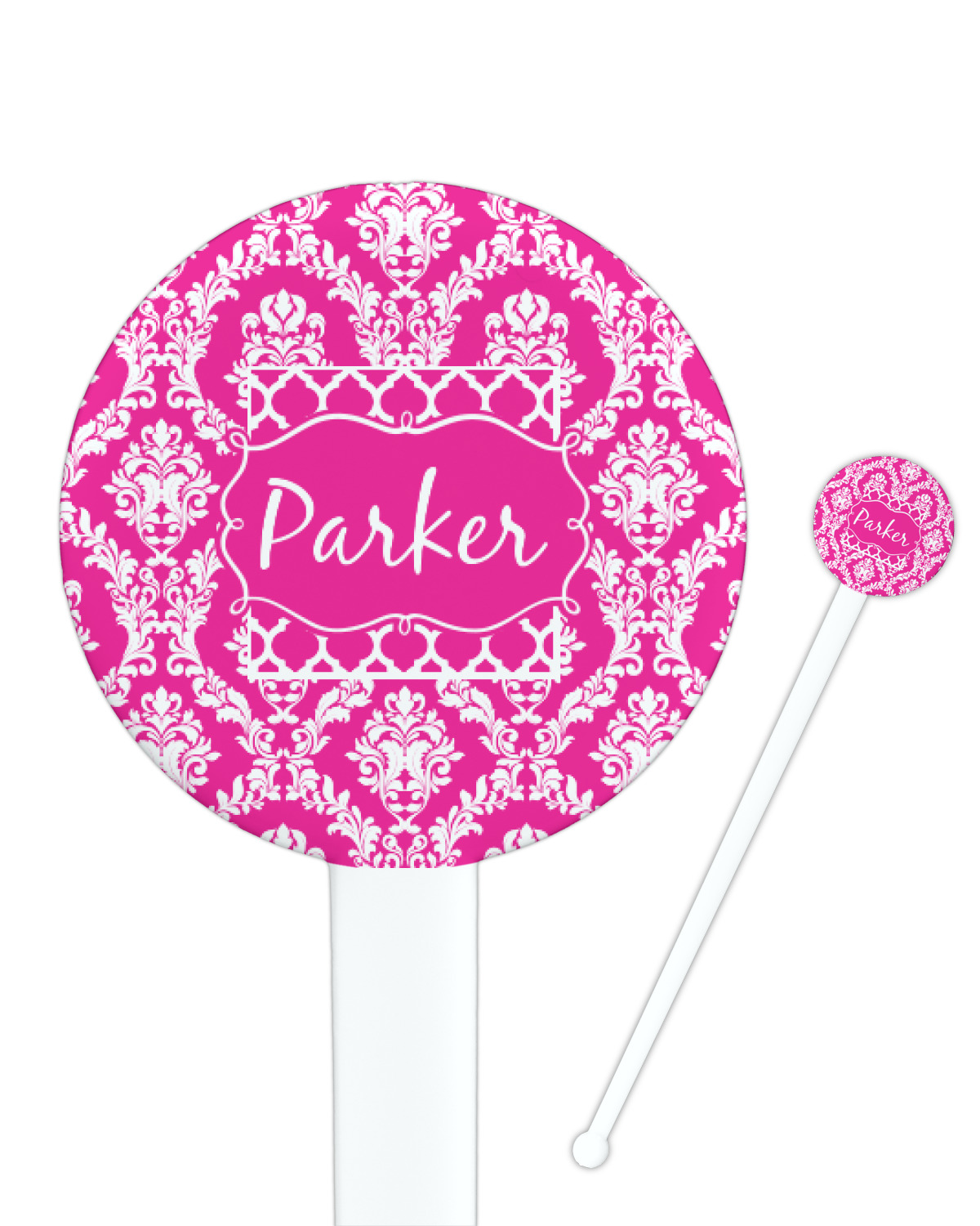 This is one of our new concentric design style - where you can use any two patterns together - we have chose to feature our damask and moroccan / trellis patterns. We chose our hot pink and white for our colors and curlz label with a name for personalization.